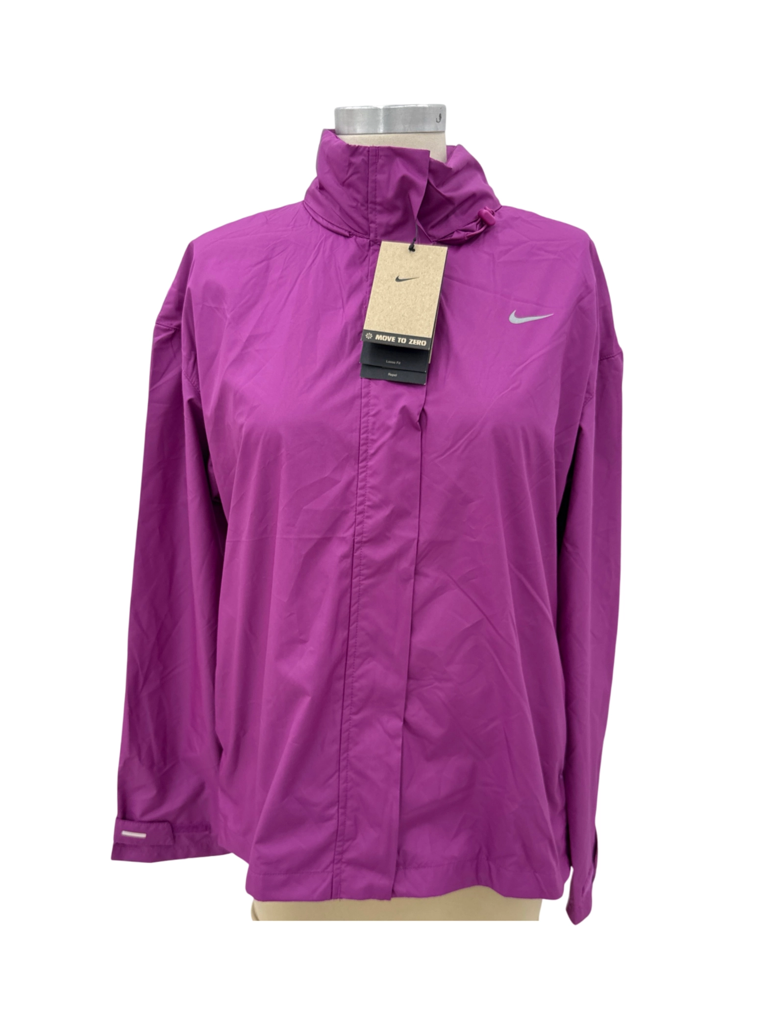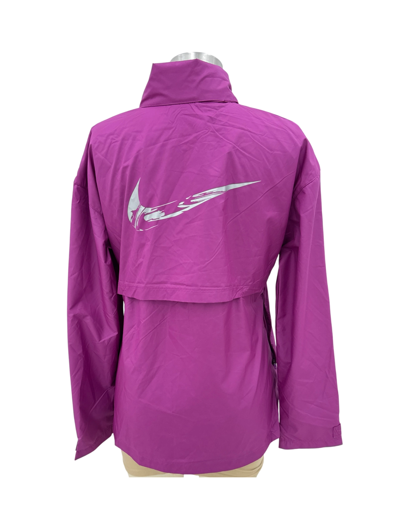 This pre-owned Nike rain jacket is a stylish and functional outerwear piece for women. It features a vibrant purple color, a comfortable design, and is made from high-quality polyester. Ideal for staying dry and comfortable in various weather conditions, this jacket is perfect for everyday wear or outdoor activities. The Nike logo adds a touch of sporty elegance. This pre-loved jacket offers great value and style.