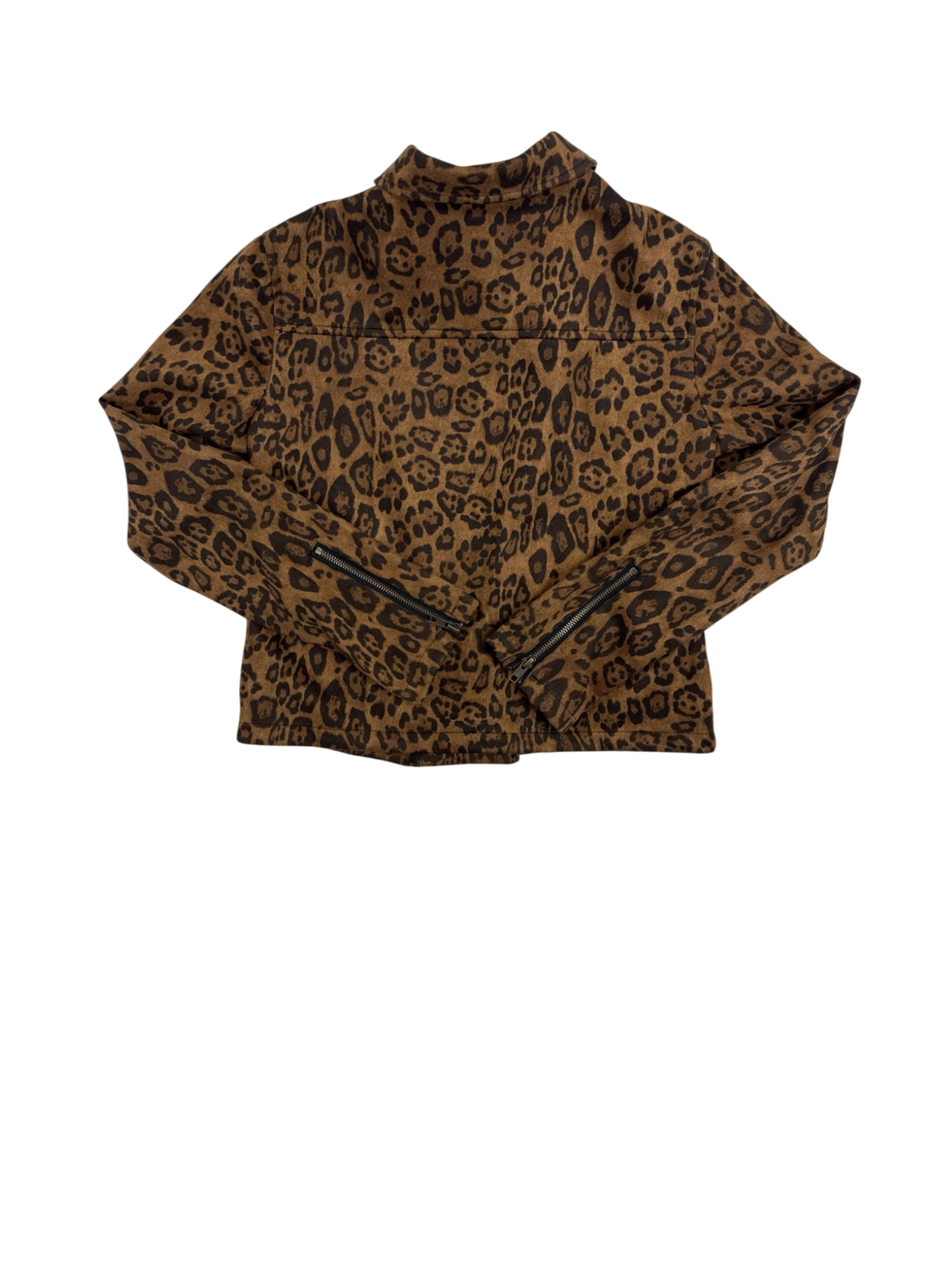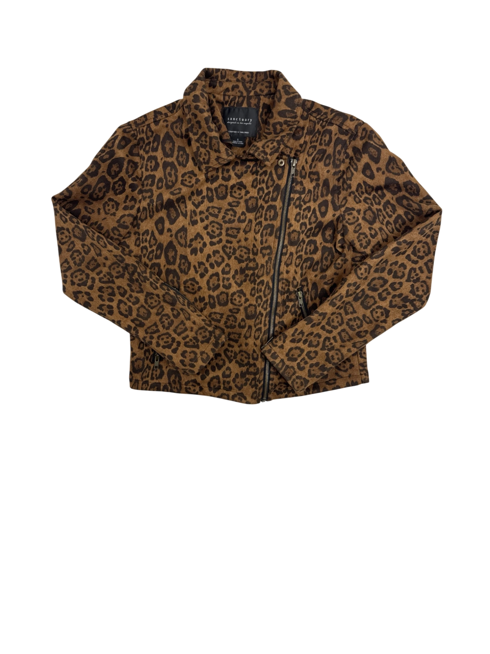 This pre-owned Sanctuary jacket is a stylish addition to any wardrobe. Featuring a striking leopard print, this motorcycle-style jacket is crafted from a comfortable blend of polyester and elastane. It's perfect for adding a touch of edge to your look. The jacket features a zip-up front, pockets, and a classic moto collar. Ideal for cooler seasons, this jacket combines fashion and function.