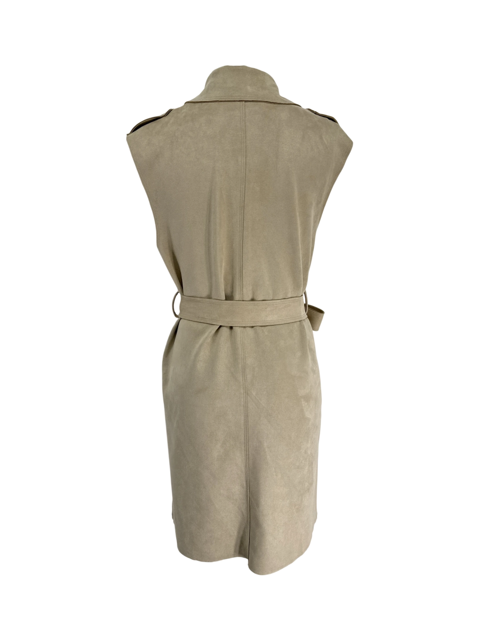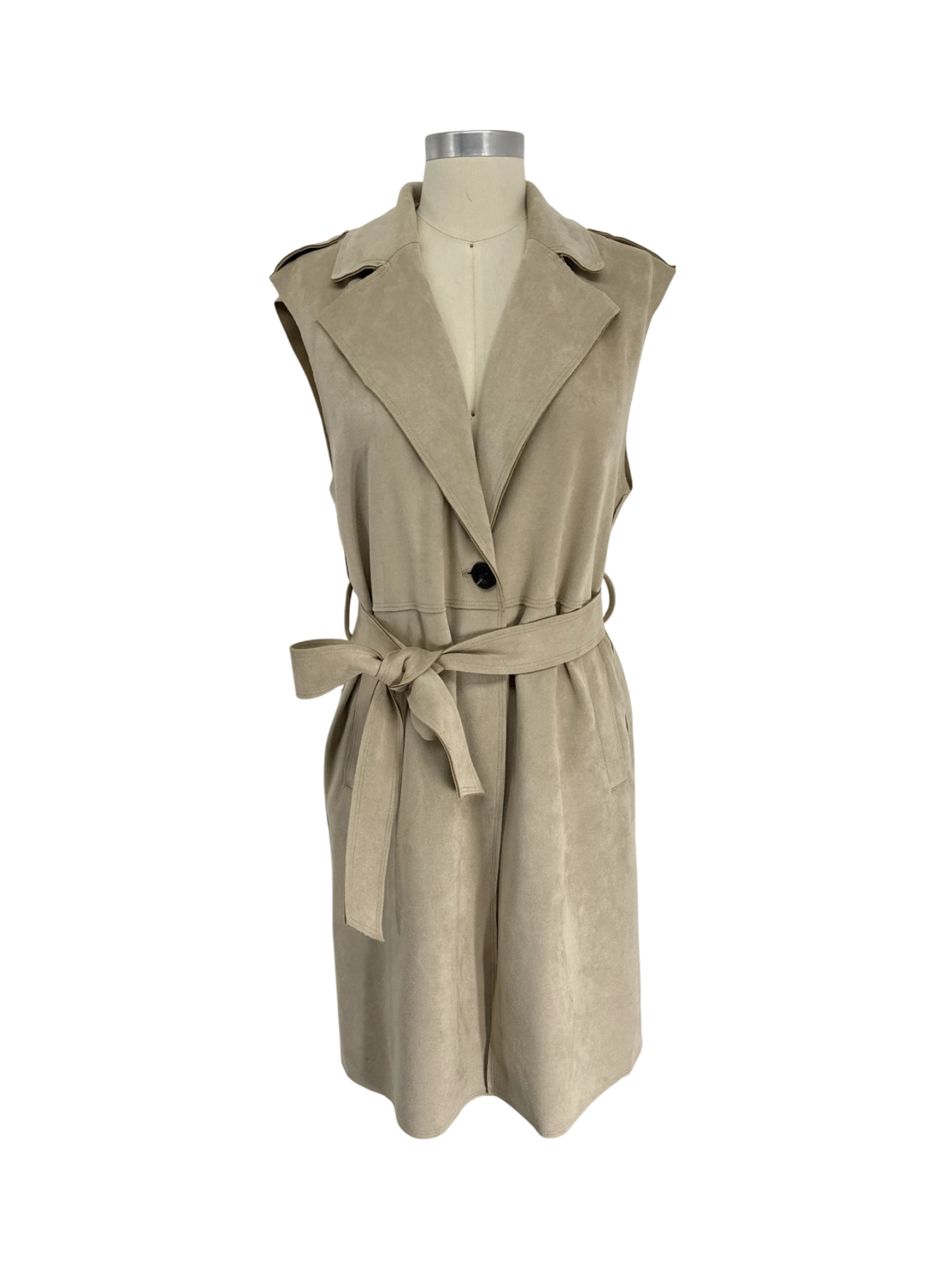 This stylish and chic pre-owned ZARA vest-style coat is a versatile addition to any wardrobe. Featuring a flattering silhouette, the coat is perfect for layering over your favorite outfits during the spring and fall seasons. The neutral beige color and sophisticated design make it an ideal choice for both casual and dressy occasions. A great item to add to your collection. - Elevate your wardrobe with this chic, pre-owned ZARA vest. This stylish piece features a belted design in a versatile beige color, making it a perfect layering option for spring and fall. Crafted with a blend of polyester and spandex for a comfortable fit, this vest is ideal for both casual and dressy occasions. Add a touch of sophistication to your outfit with this timeless piece.