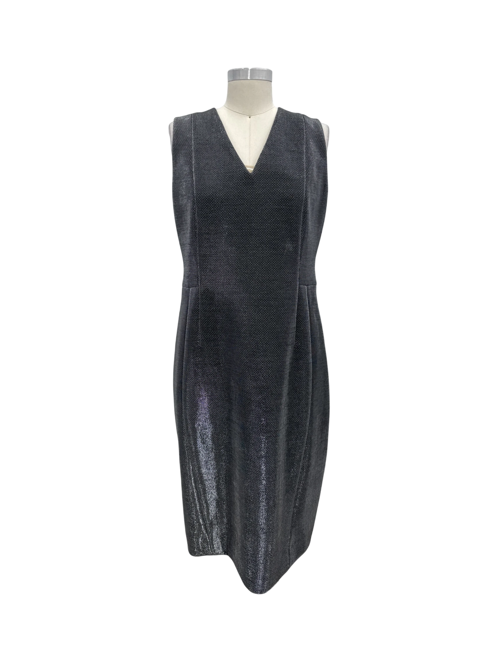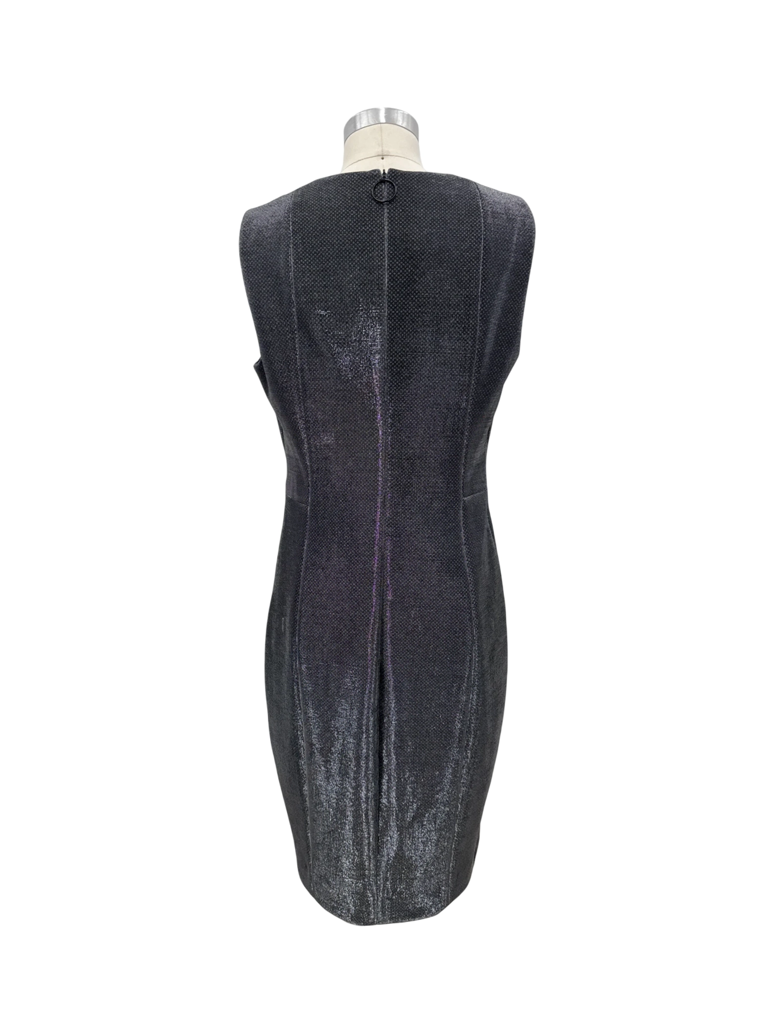 This elegant A-K-R-I-S-punto sheath dress is perfect for a sophisticated look. Made from a blend of polyester and viscose, it features a flattering V-neck, sleeveless design, and hits at the knee. The shimmering gray metallic fabric adds a touch of glamour, making it ideal for cocktail parties, special events, or a night out. It is in great condition and ready to wear.