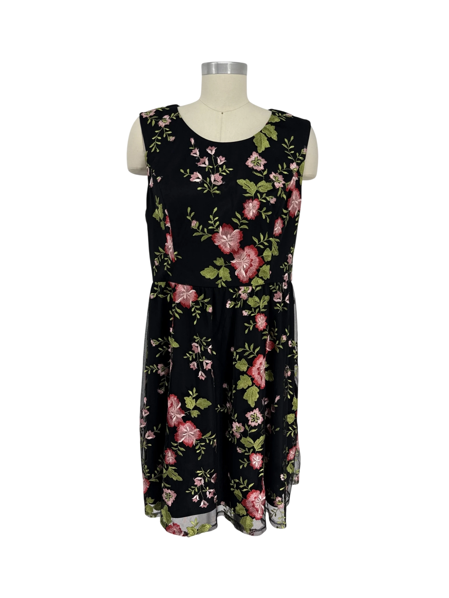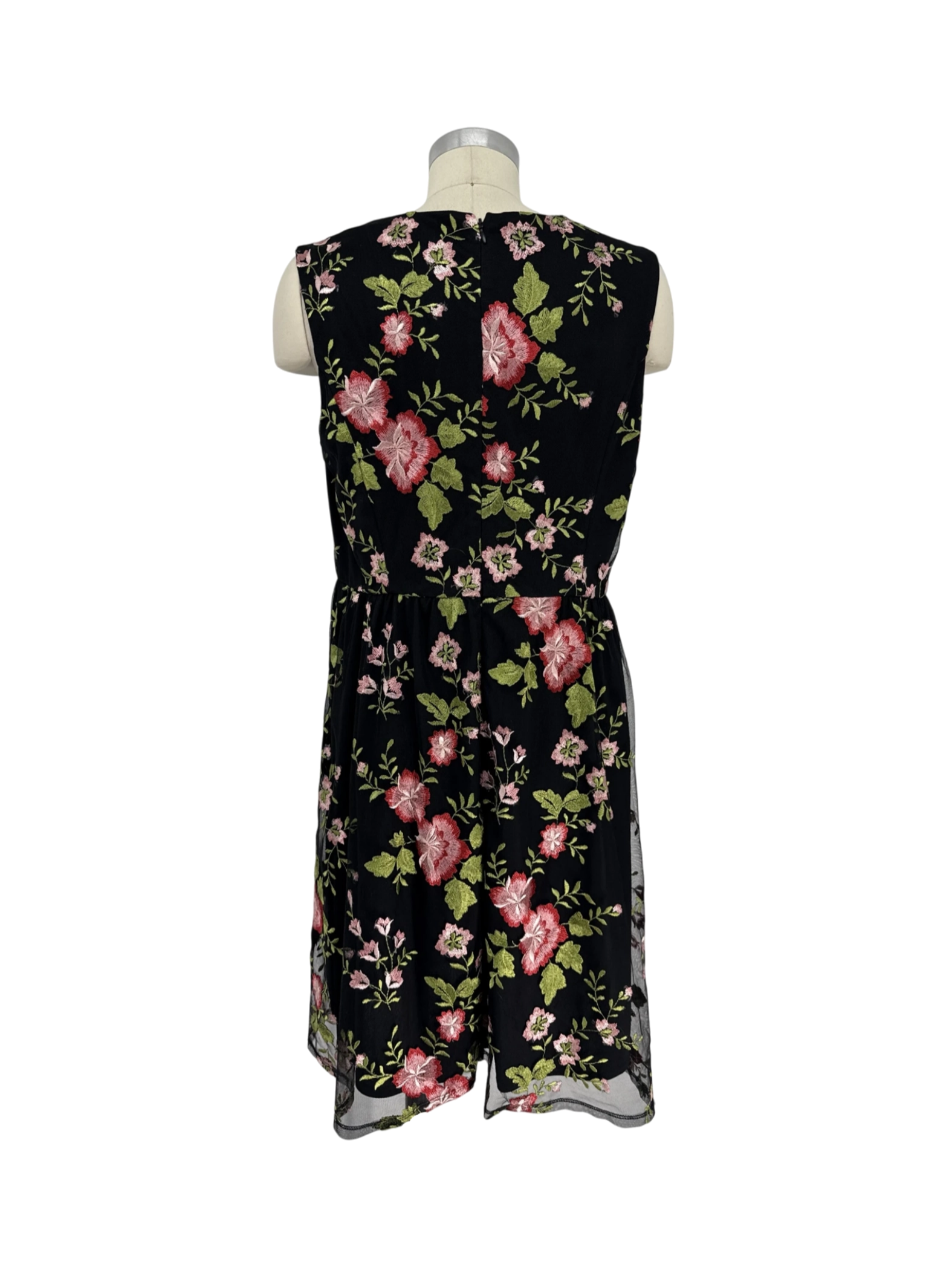 This beautiful pre-owned Lace & Mesh dress is perfect for any casual occasion. Featuring a flattering A-line silhouette and a delicate floral pattern on a black background, this sleeveless dress is ideal for spring and summer. Crafted from comfortable polyester, it is designed to keep you cool and stylish. The dress is a size Large.