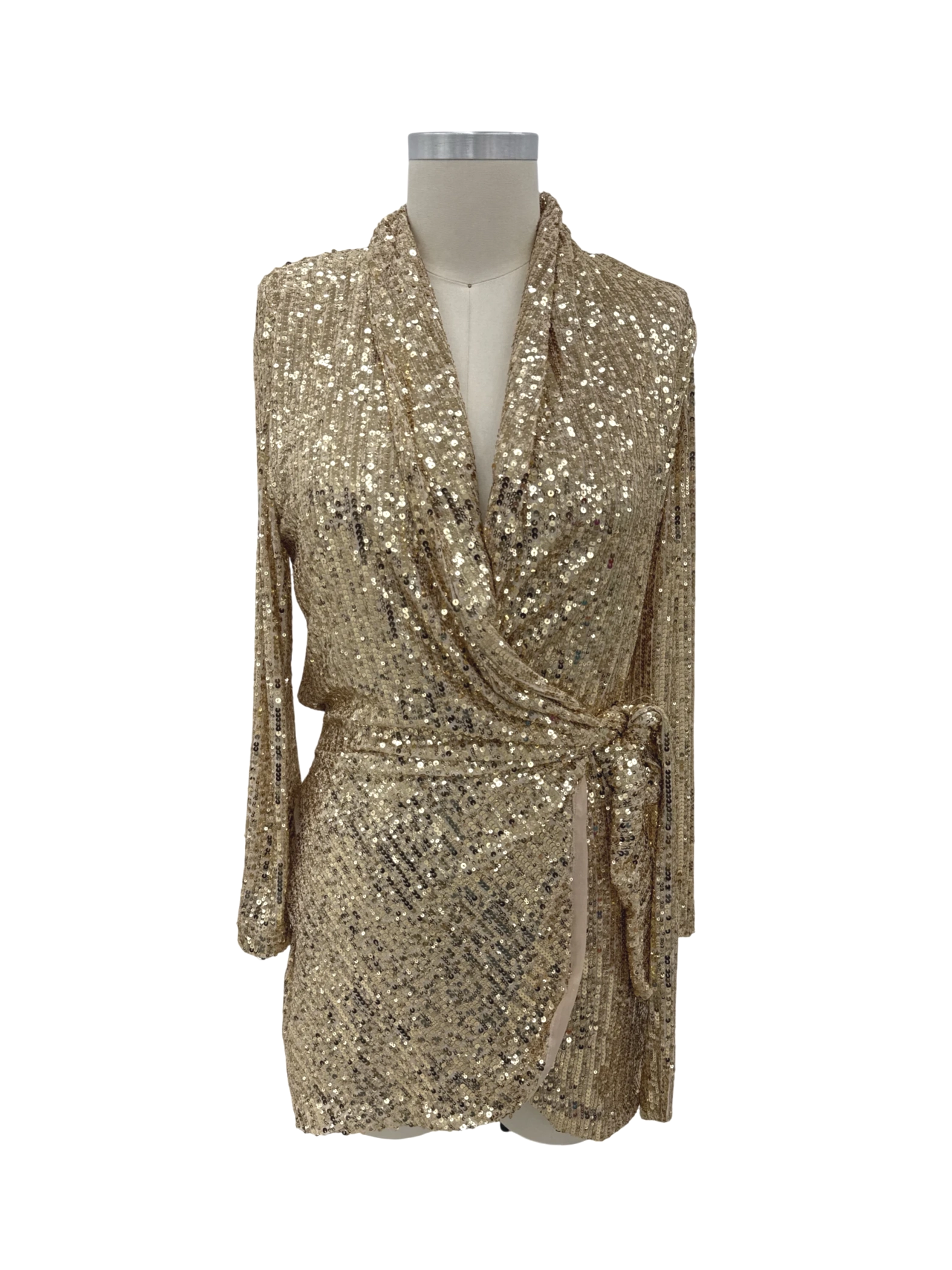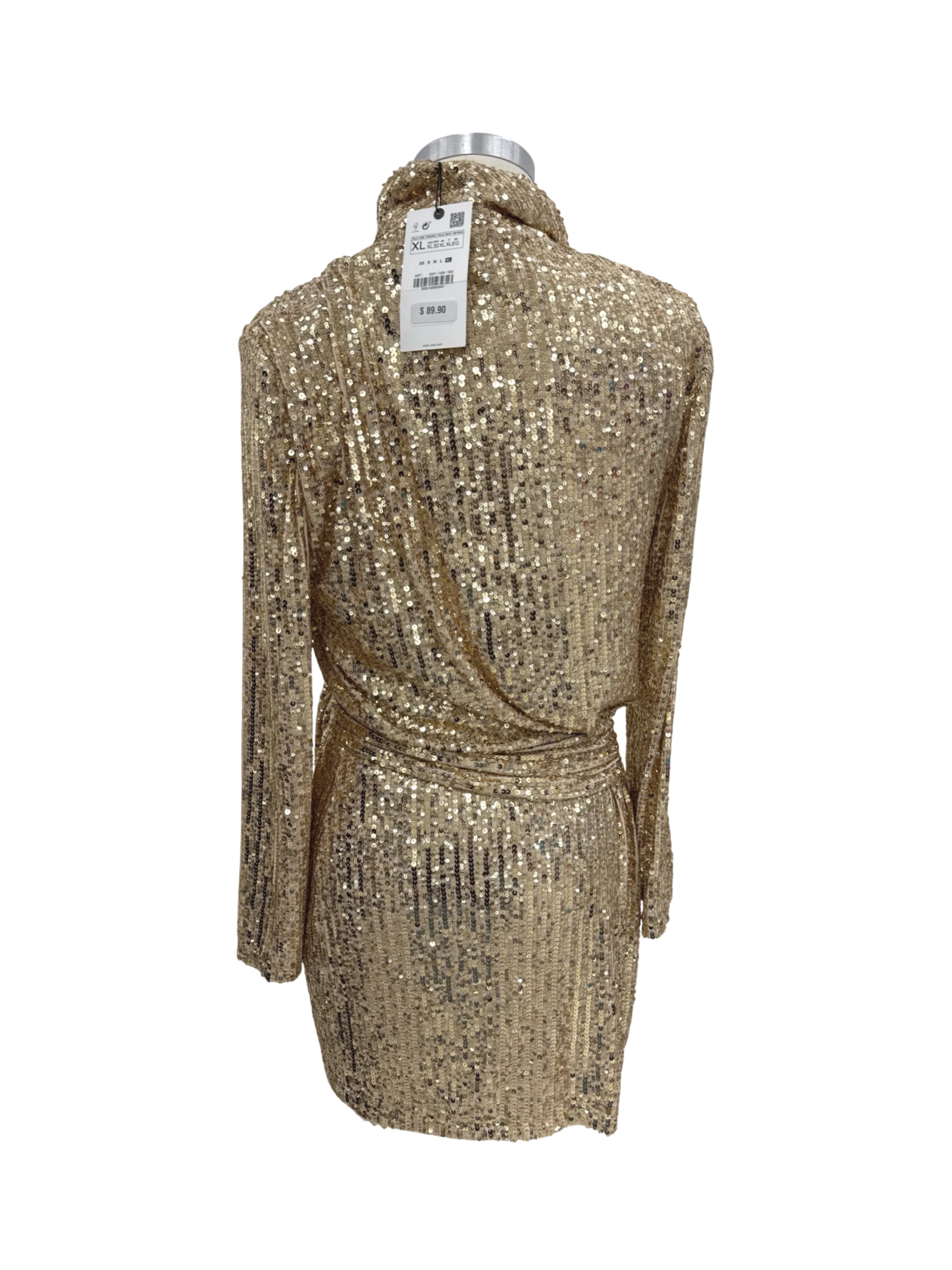 Elevate your evening look with this stunning sequin wrap dress from Zara. Perfect for parties or a night out, this dress features a flattering wrap design, long sleeves, and a mini length. Crafted from shimmering gold sequins, it's sure to turn heads. This pre-owned Zara dress is in excellent condition and offers a touch of glamour. Pair it with your favorite heels for a dazzling ensemble. - Shine bright in this stunning, pre-owned ZARA sequin wrap dress. Perfect for a night out, this dress features a flattering wrap design, long sleeves, and a mini length. Adorned with shimmering gold sequins, it's sure to turn heads. Made with high-quality polyester, this dress offers both style and comfort. Ideal for cocktail parties, holiday events, or any special occasion, it is a statement piece that will elevate any wardrobe. Size XL.