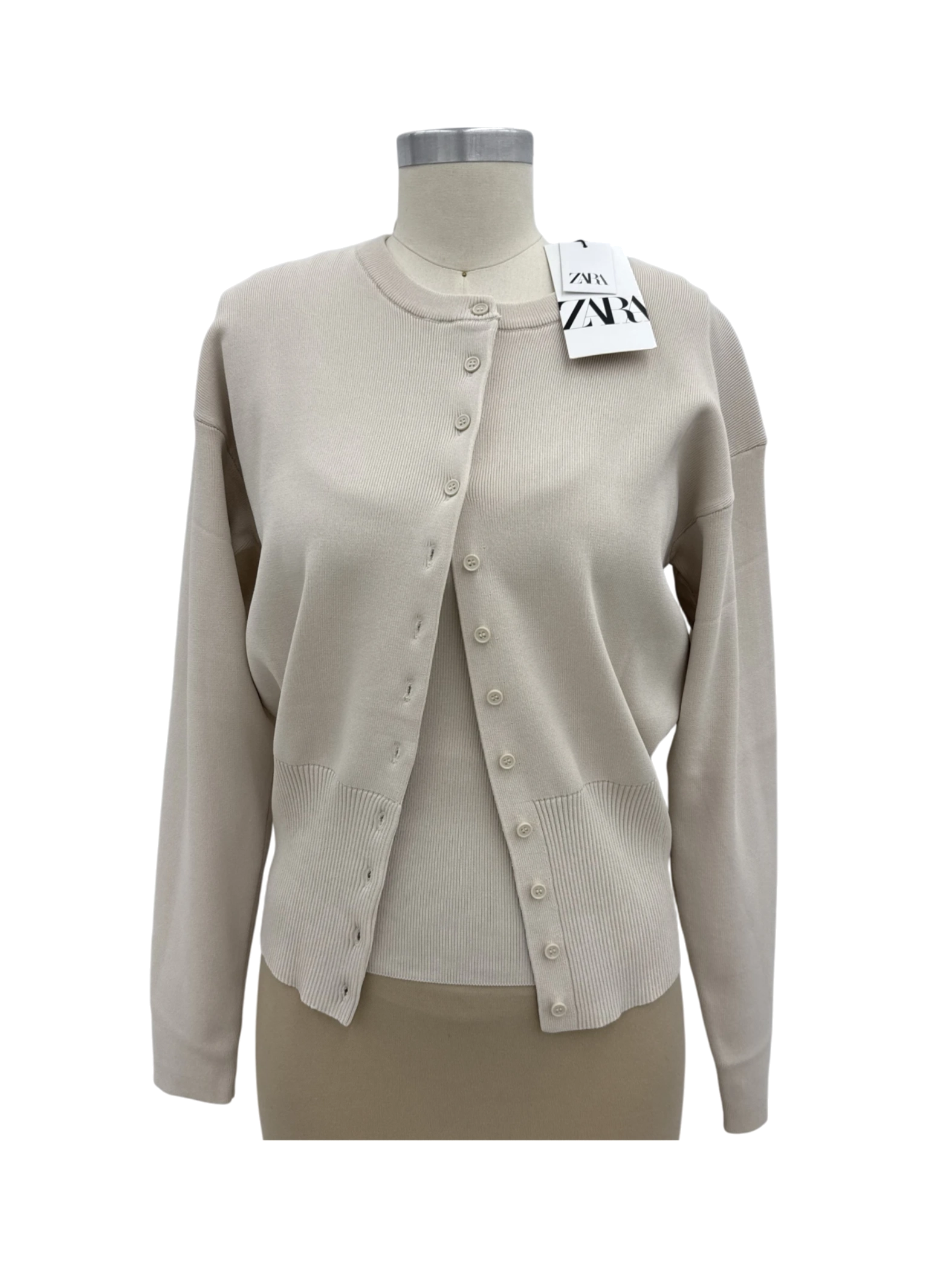 This elegant ZARA cardigan set is a must-have for your wardrobe. The set features a matching cardigan and tank top in a neutral beige color. The cardigan is designed with a round neck and long sleeves, creating a flattering silhouette. Made from a soft, high-quality viscose blend, this set is perfect for layering, offering both comfort and style. Ideal for casual outings, it adds a touch of sophistication to any outfit. A pre-owned piece in excellent condition.