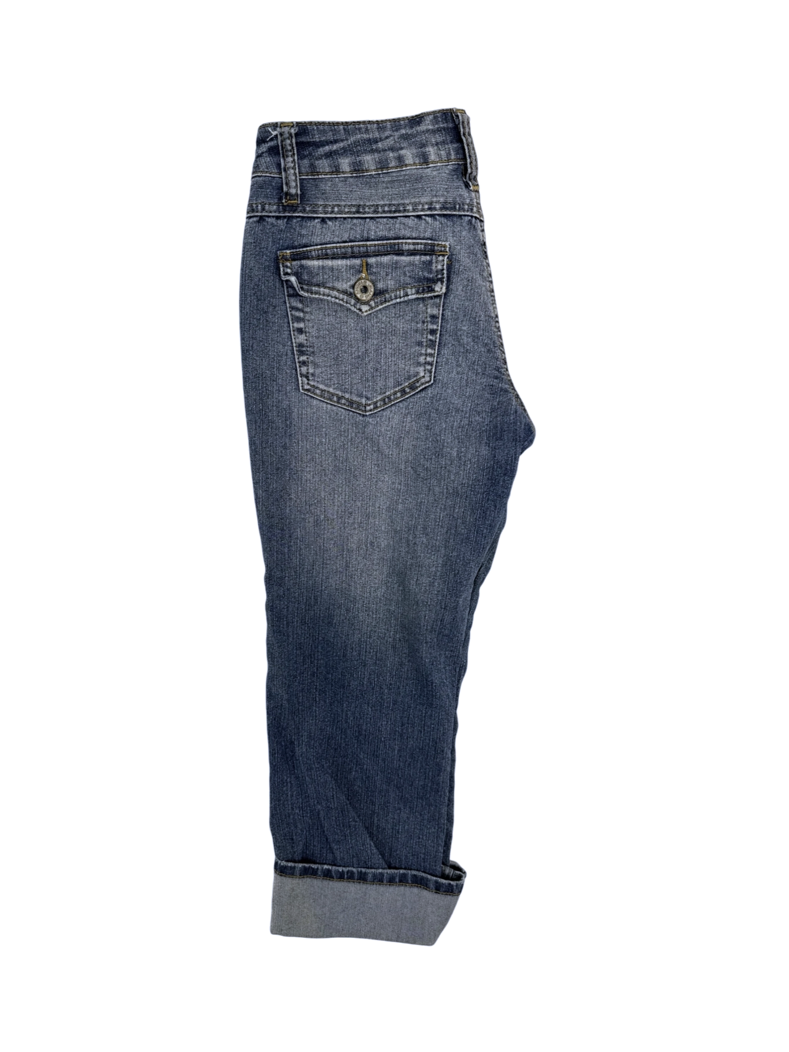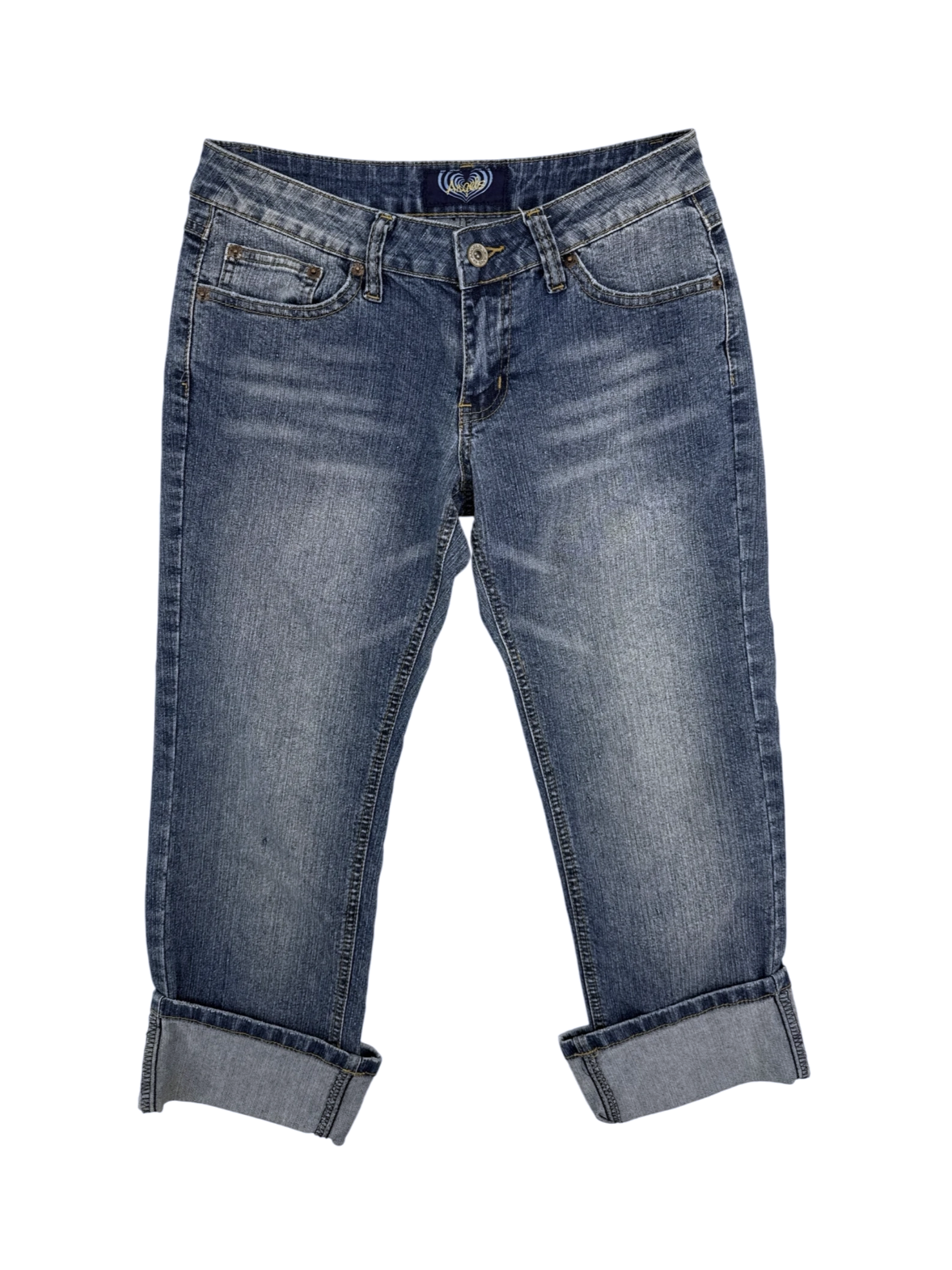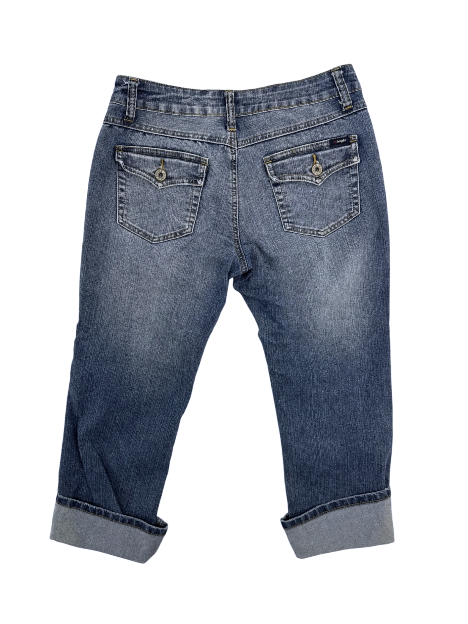 These gently used Angels jeans are a stylish addition to any wardrobe. Crafted from a blend of cotton, polyester, and spandex, these boot-cut jeans offer a comfortable fit. The medium wash denim and classic design make them versatile for various occasions. Size 7, these jeans are perfect for a range of body types. This pre-owned pair provides an affordable option without compromising on style. Upgrade your denim collection with these trendy and durable jeans.