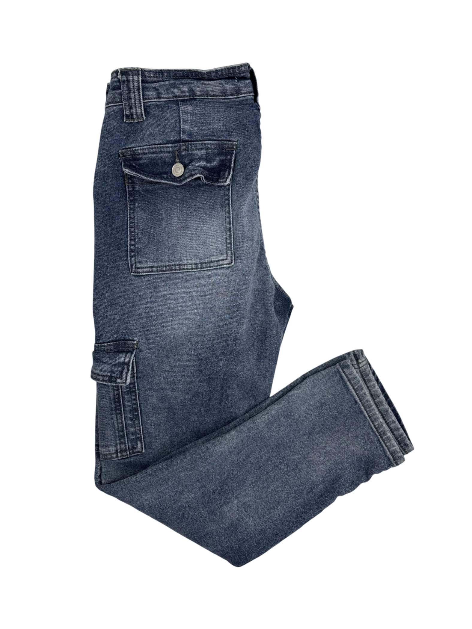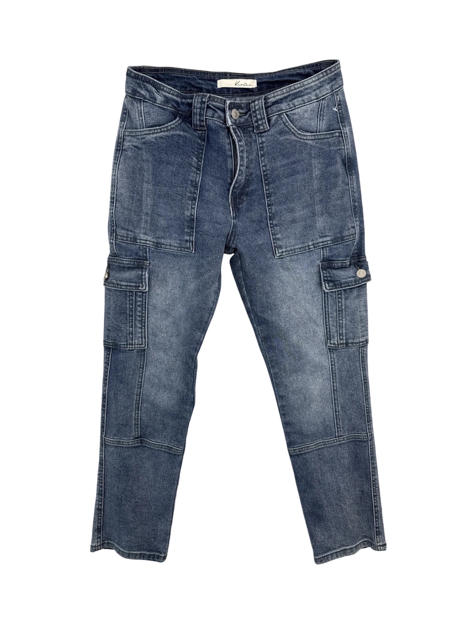 Elevate your denim game with these stylish KanCan cargo jeans. Crafted from a blend of cotton and spandex for a comfortable fit, these jeans feature a classic straight leg and a medium wash. The cargo pockets add a touch of utility-chic to your look. Perfect for everyday wear, these jeans are a versatile addition to any wardrobe. Get ready to make a statement with this timeless piece that offers both style and functionality.