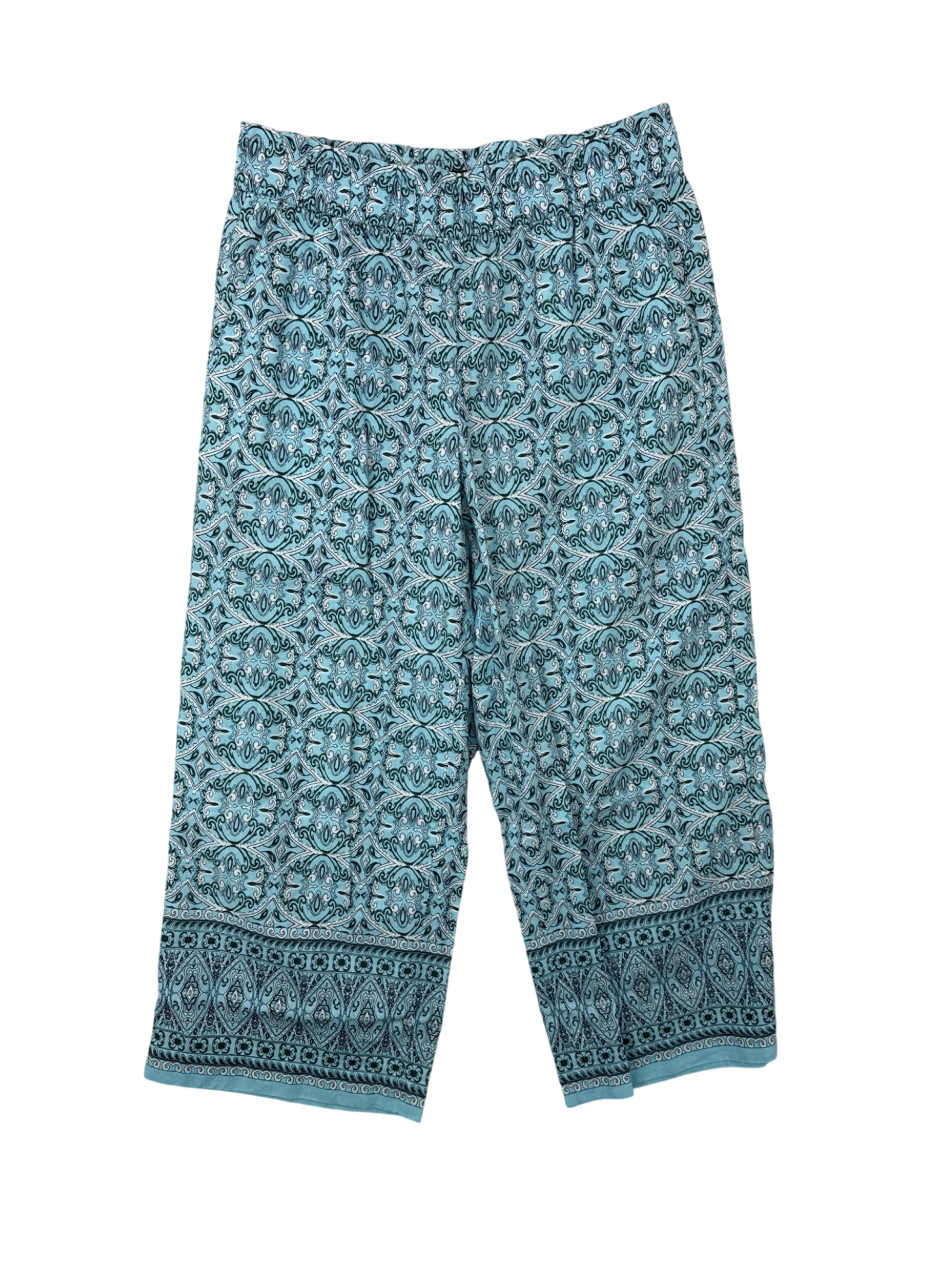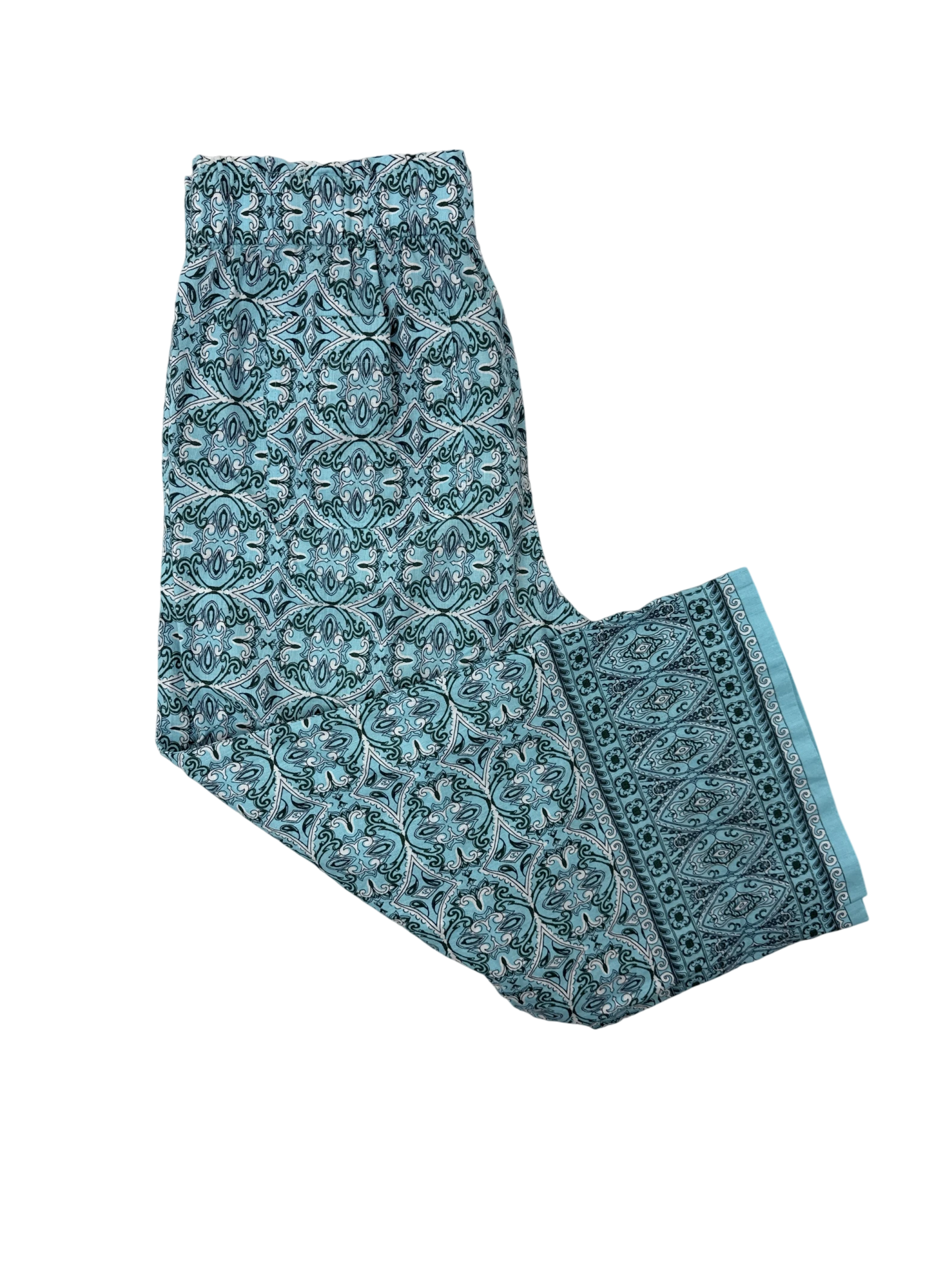 Elevate your summer wardrobe with these pre-owned TALOTS palazzo pants. Crafted from lightweight polyester fabric, these pants feature a vibrant blue floral print. They have a comfortable wide-leg fit, perfect for warm weather. The elastic waistband ensures a great fit. These stylish palazzo pants offer a touch of elegance and are versatile enough for casual or dressier occasions.