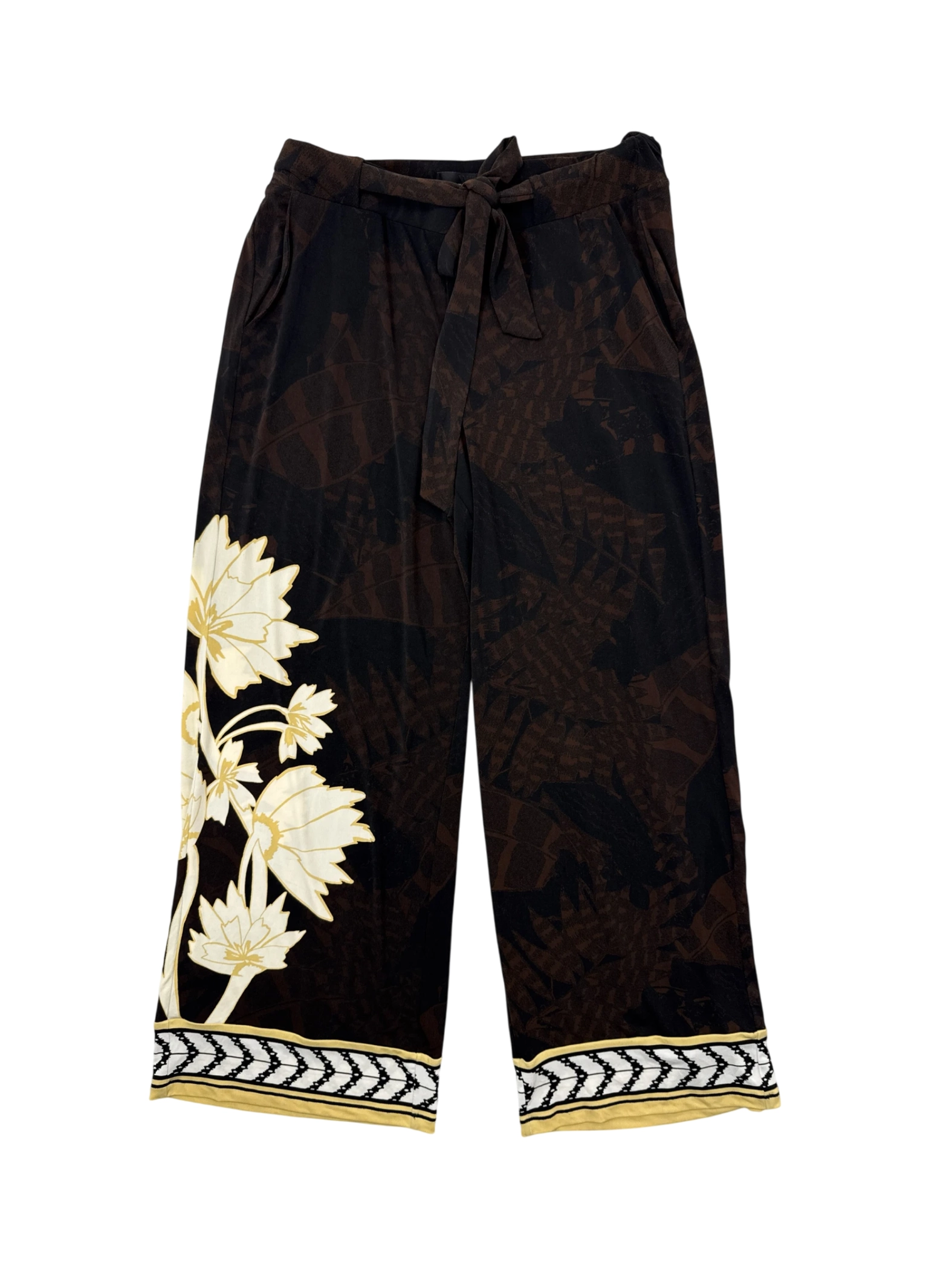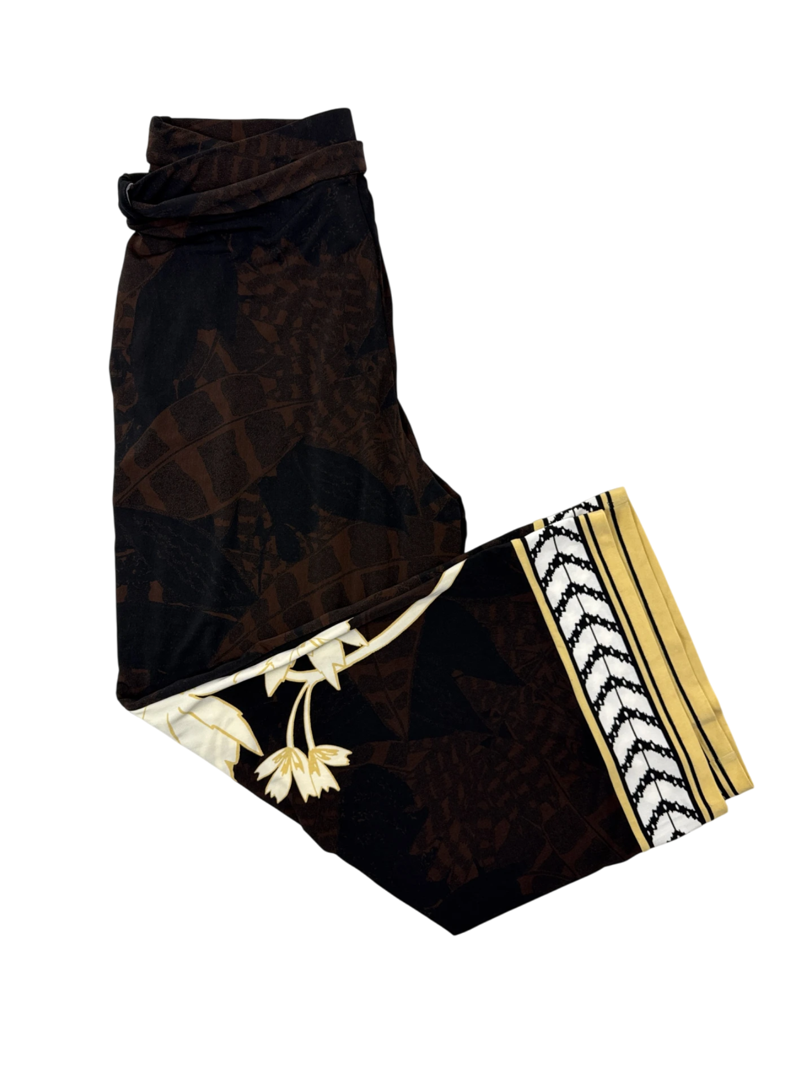 Elevate your wardrobe with these stylish pre-owned White House Blackmarket palazzo pants. Featuring a striking floral pattern on a black background, these wide-leg pants offer both comfort and flair. The lightweight polyester and spandex blend ensures a comfortable fit, while the wide-leg cut and intricate design add a touch of sophistication. Perfect for a casual outing or a dressed-up event.