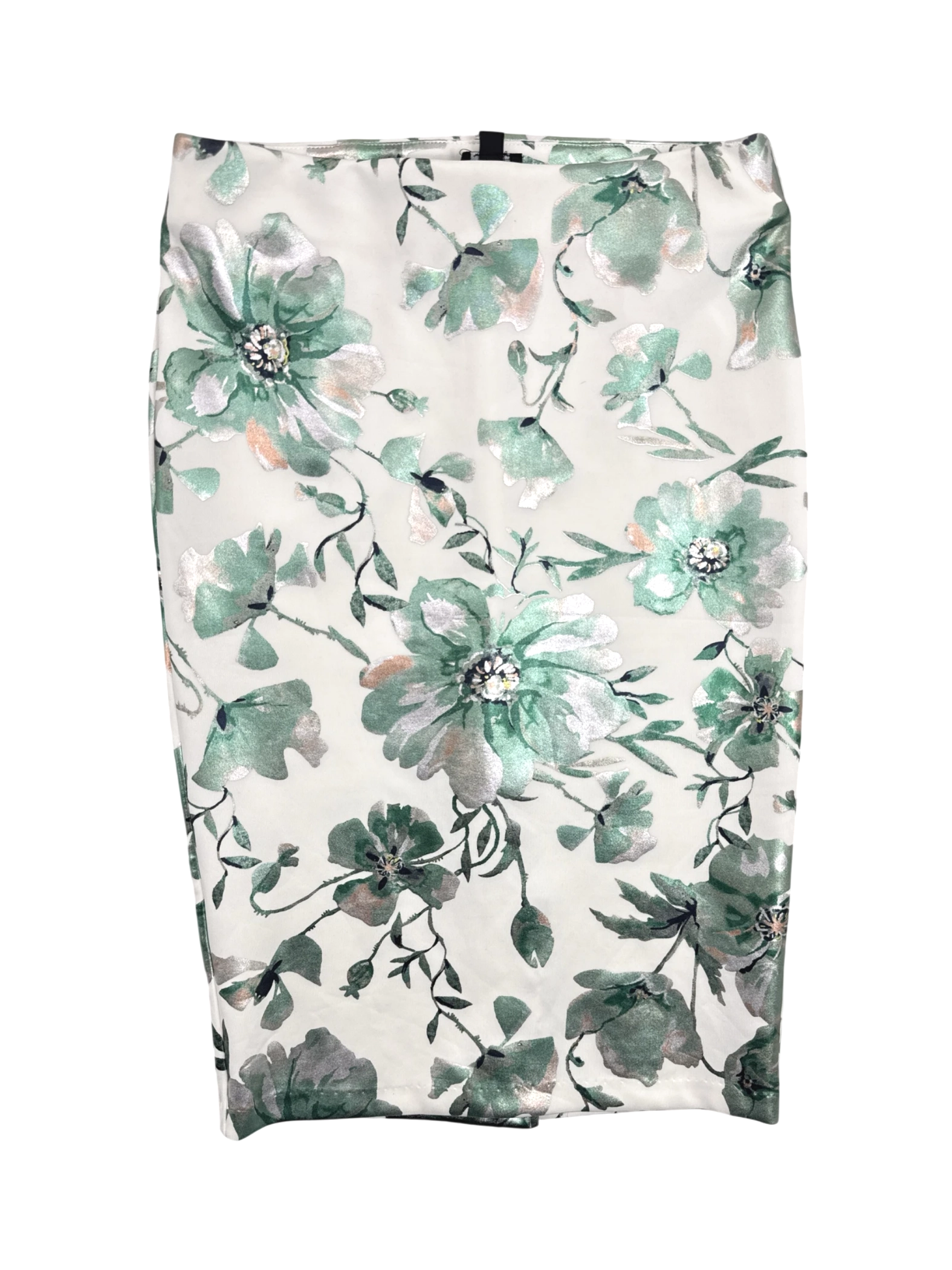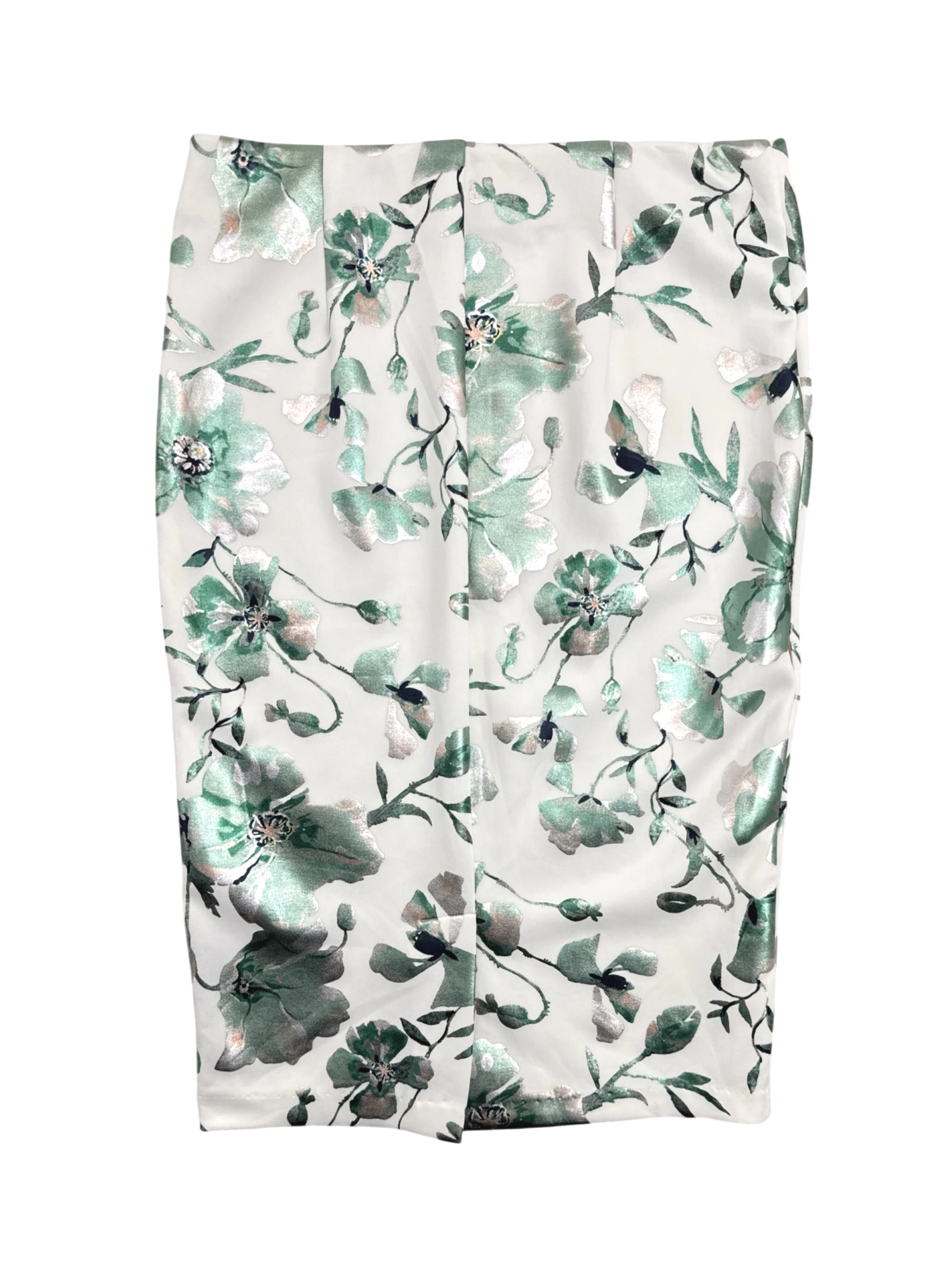 This pre-owned ECI New York pencil skirt is perfect for spring and summer. The skirt features a beautiful floral pattern in shades of green and silver on a white background. Made from a comfortable blend of polyester and spandex, this midi-length skirt offers a flattering fit. Ideal for a casual day out or a dressed-up occasion, the skirt adds a touch of elegance to any wardrobe. The skirt is in excellent condition.