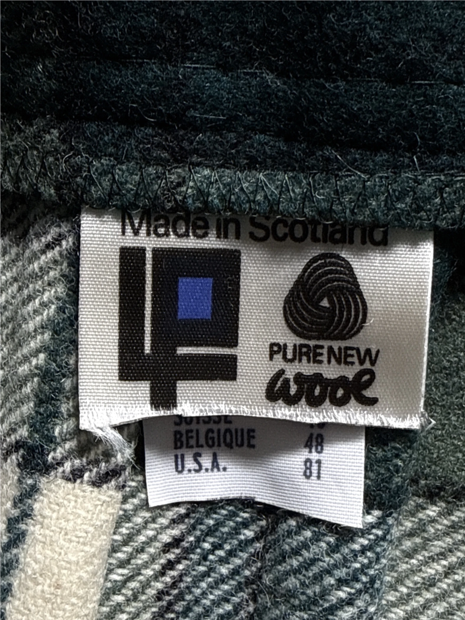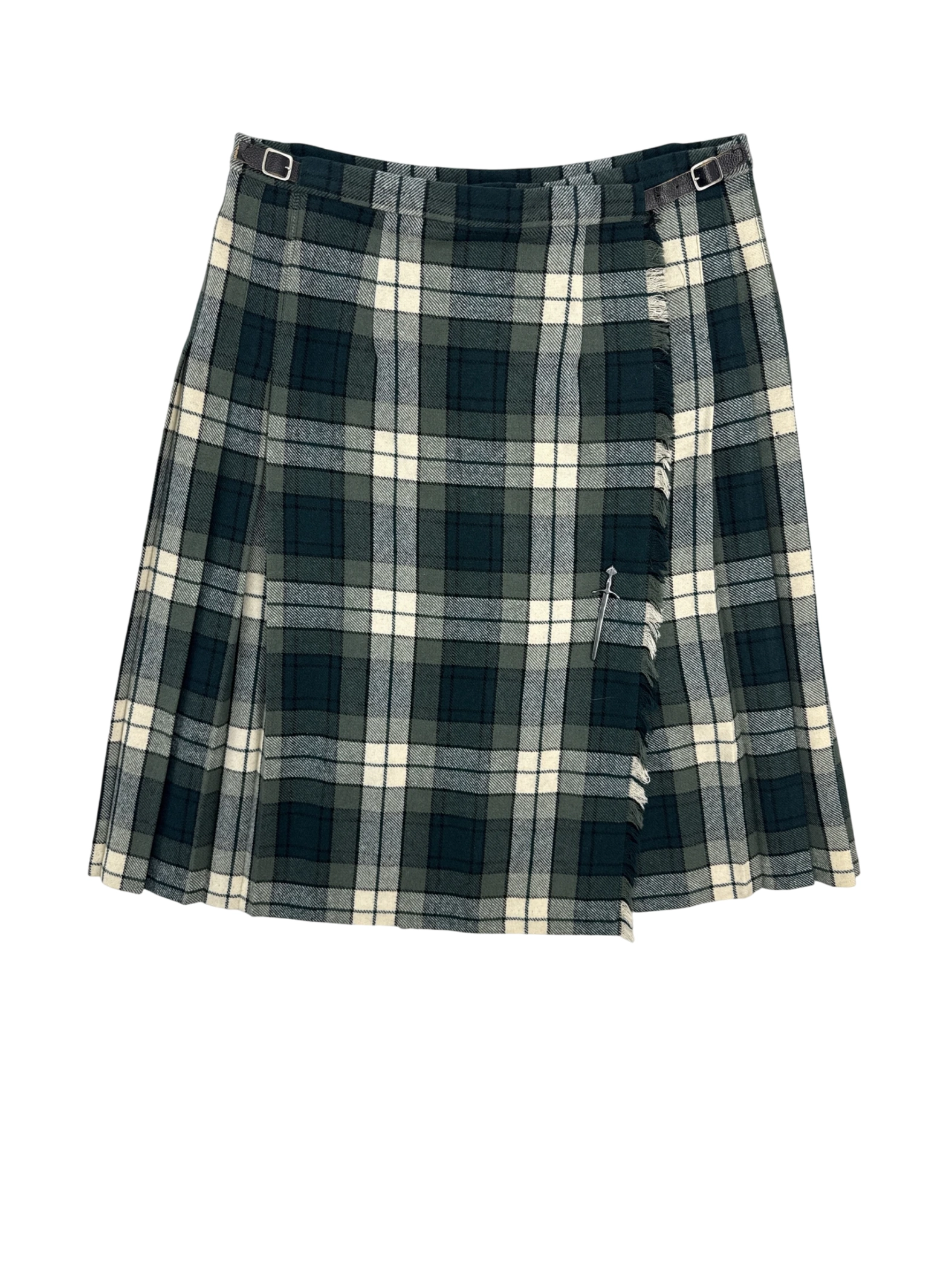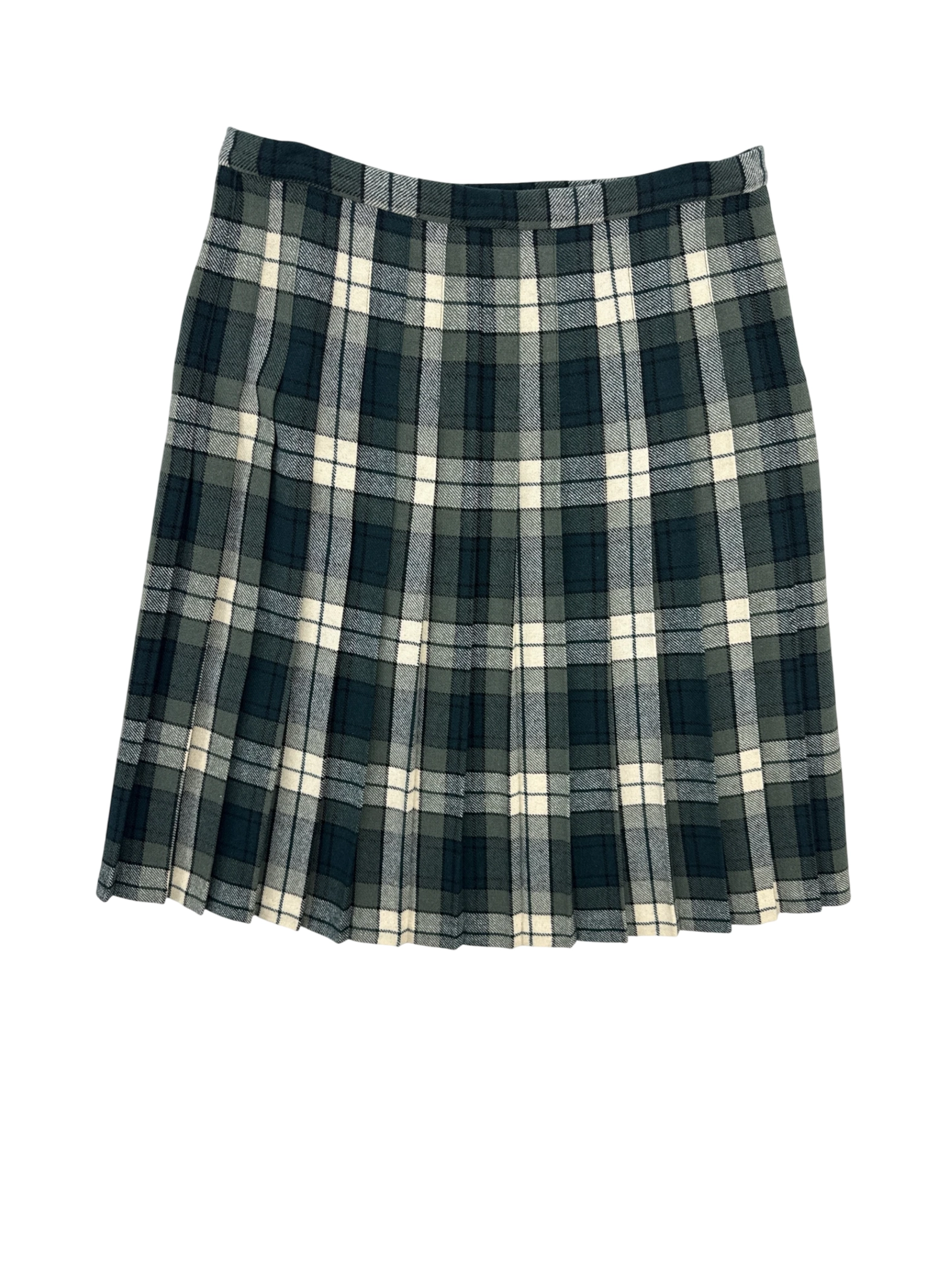 This vintage LP mini skirt is crafted from 100% pure new wool in Scotland. Featuring a classic pleated design and a wrap style, it showcases a timeless plaid pattern in shades of green, white, and gray. Perfect for fall and winter, this skirt offers a stylish and warm option for any wardrobe. It includes belt loops and is a unique piece of fashion history. A perfect skirt for your wardrobe.