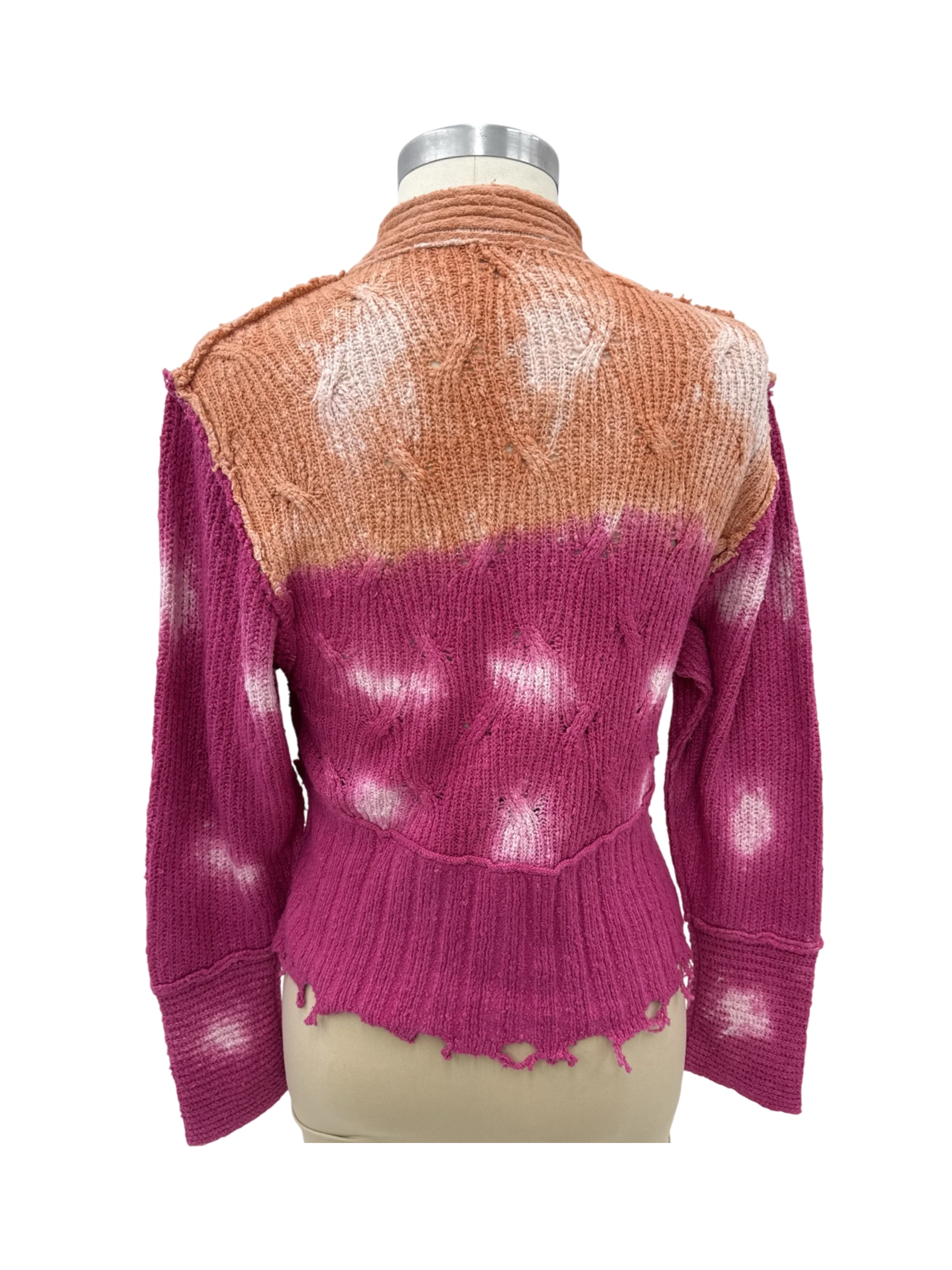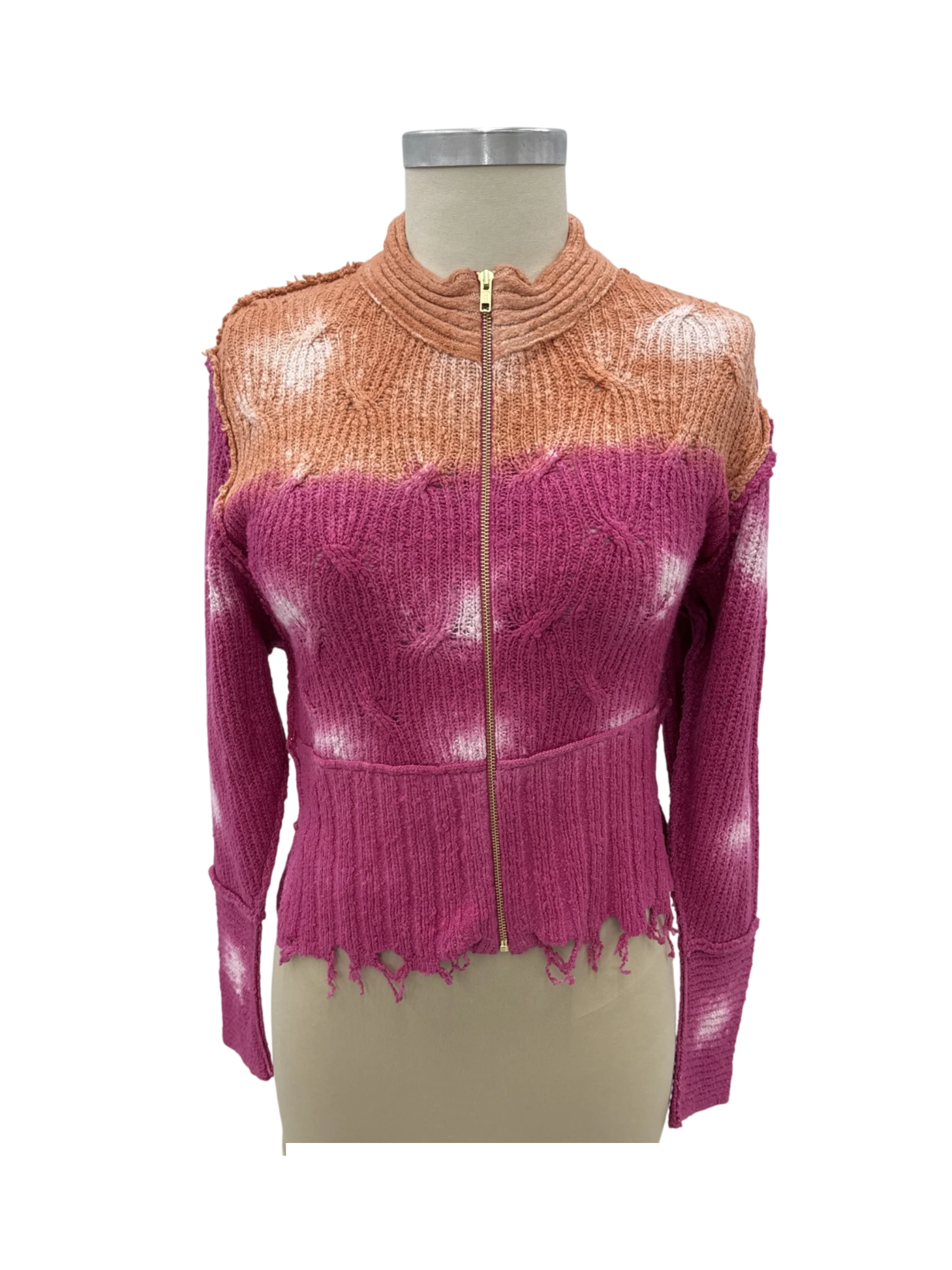 This Free People cardigan is a stylish and unique addition to your wardrobe. This pre-owned sweater is in excellent condition, featuring a striking purple and brown color gradient and distinctive distressed detailing. It's perfect for layering during the fall and winter seasons. The zip-up design adds functionality, while the blend of cotton and nylon ensures a comfortable fit. This cardigan is a chic and versatile piece, ideal for anyone looking to add a touch of bohemian flair to their everyday outfits.