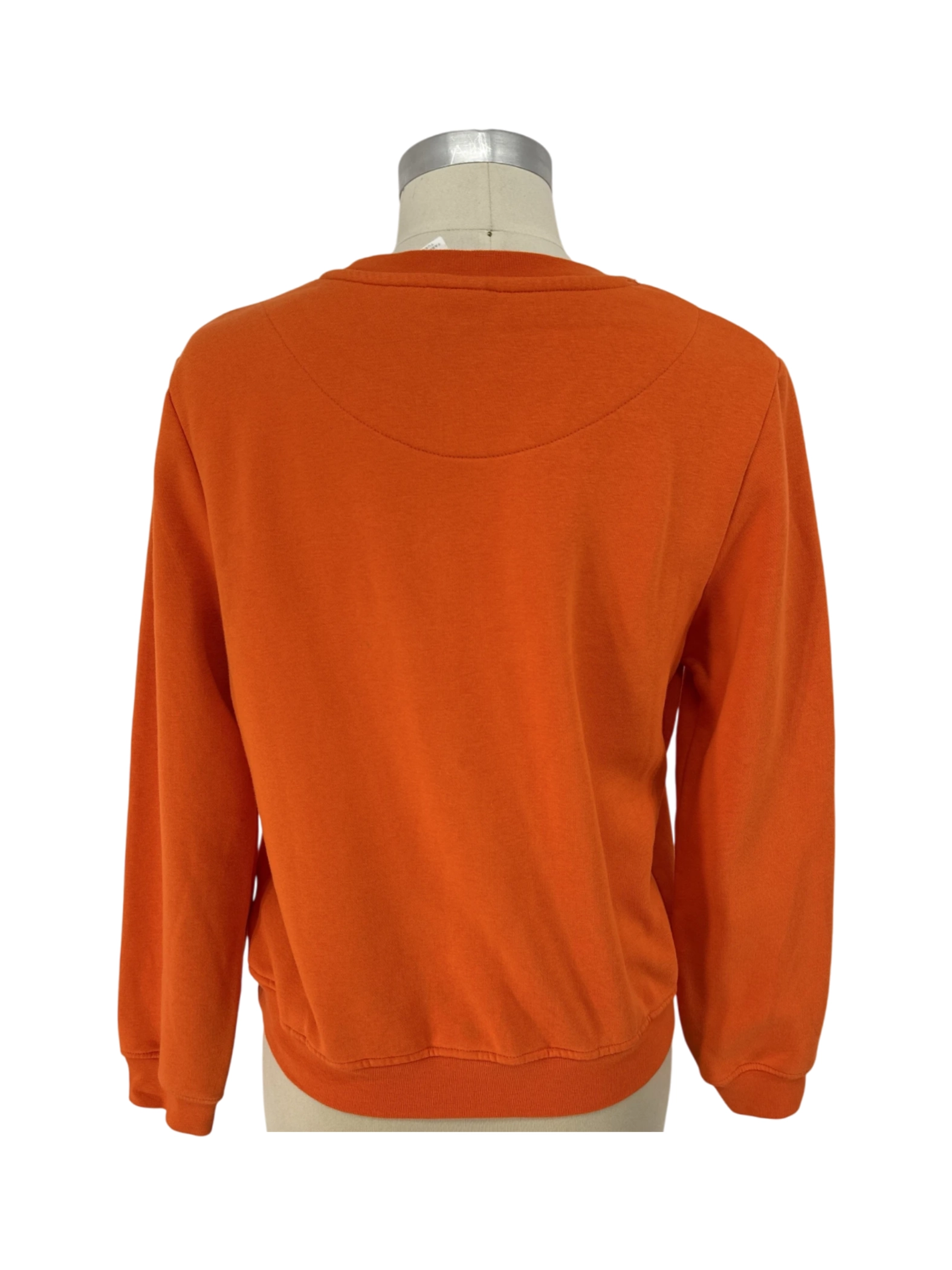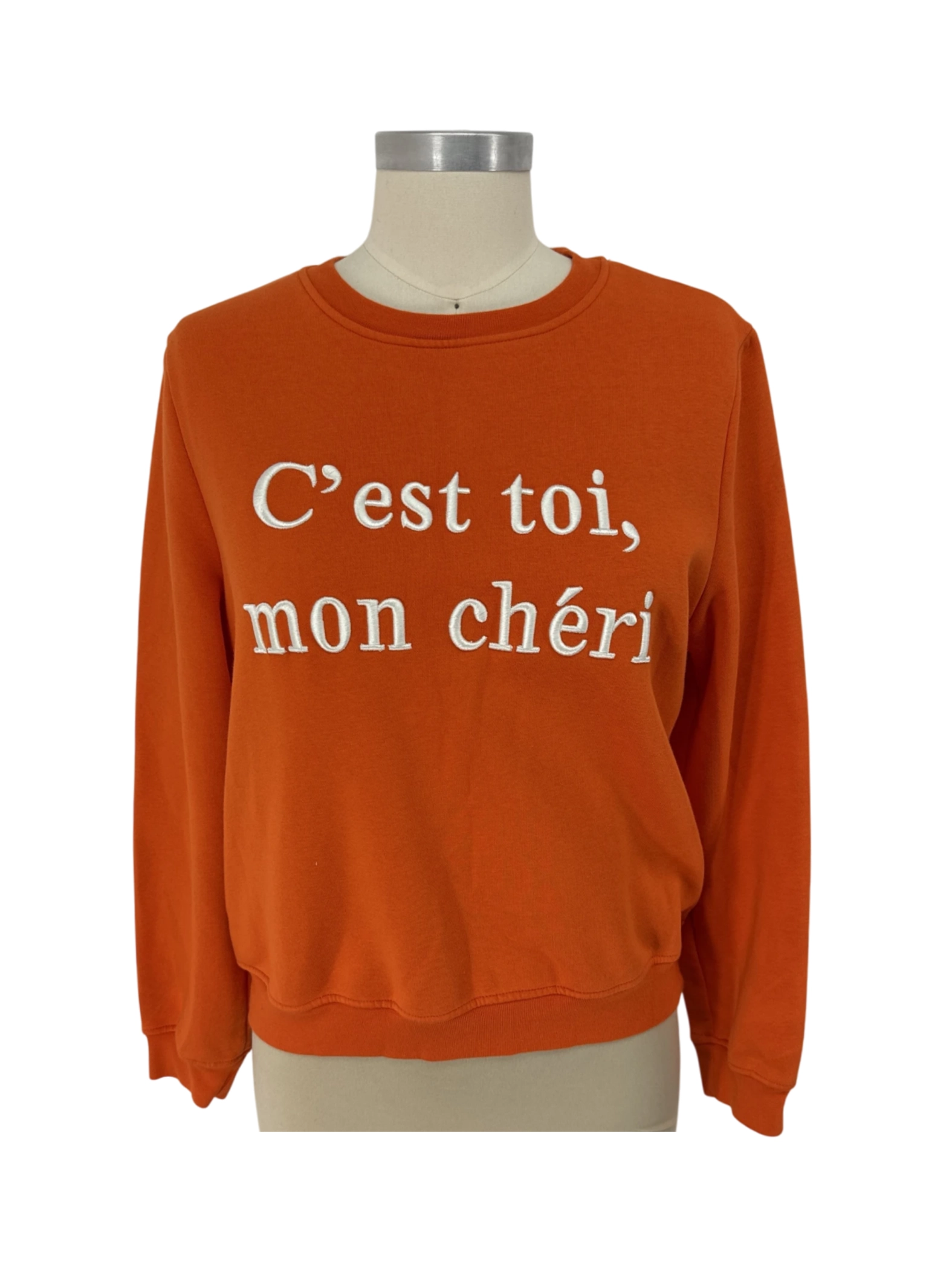 This pre-owned H&M sweater is a cozy and stylish addition to any wardrobe. The vibrant orange color makes a statement, while the soft fabric ensures all-day comfort. Featuring a classic crew neck and long sleeves, this pullover sweater is perfect for layering. The French text adds a touch of charm. Ideal for fall or winter, this sweater combines effortless style with everyday wearability. Get ready to turn heads with this chic, affordable piece!