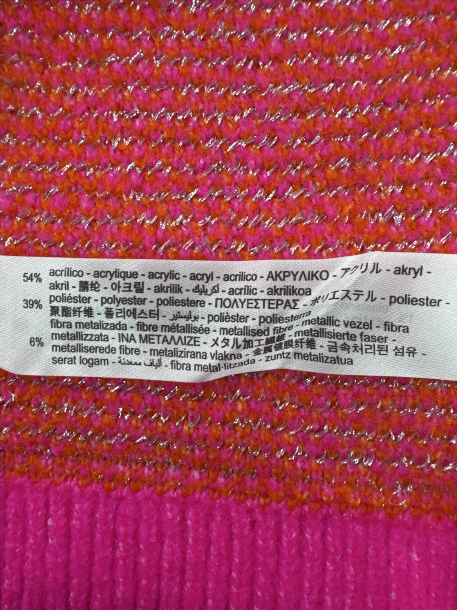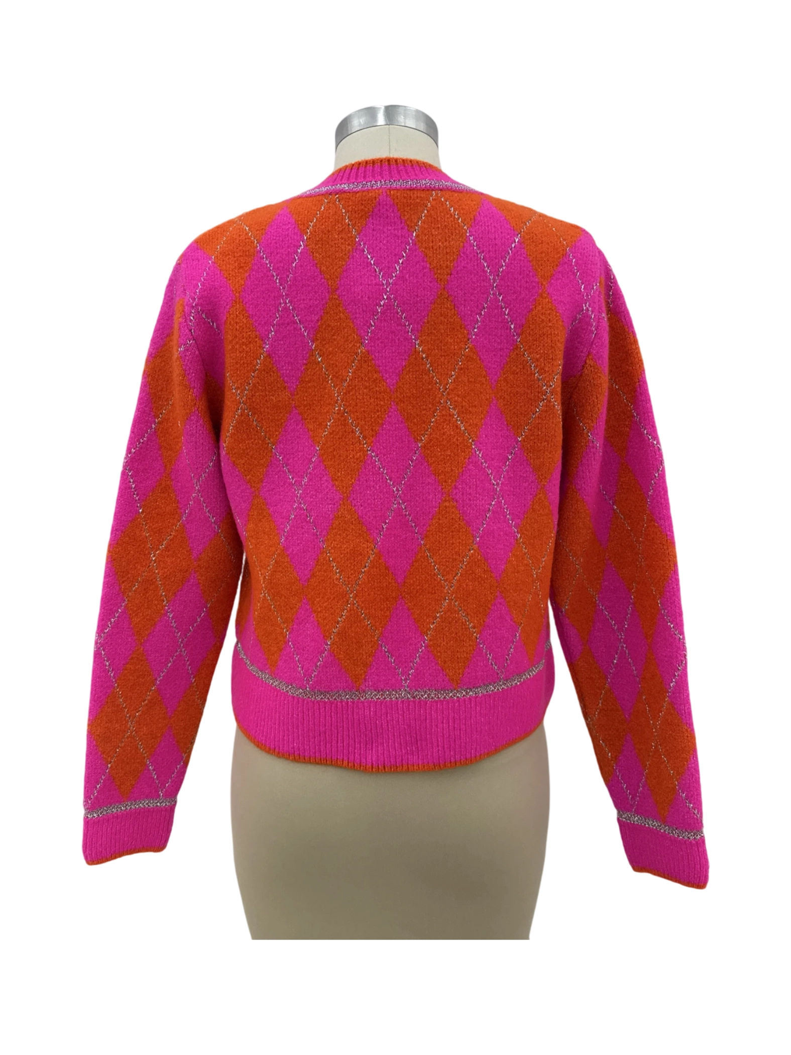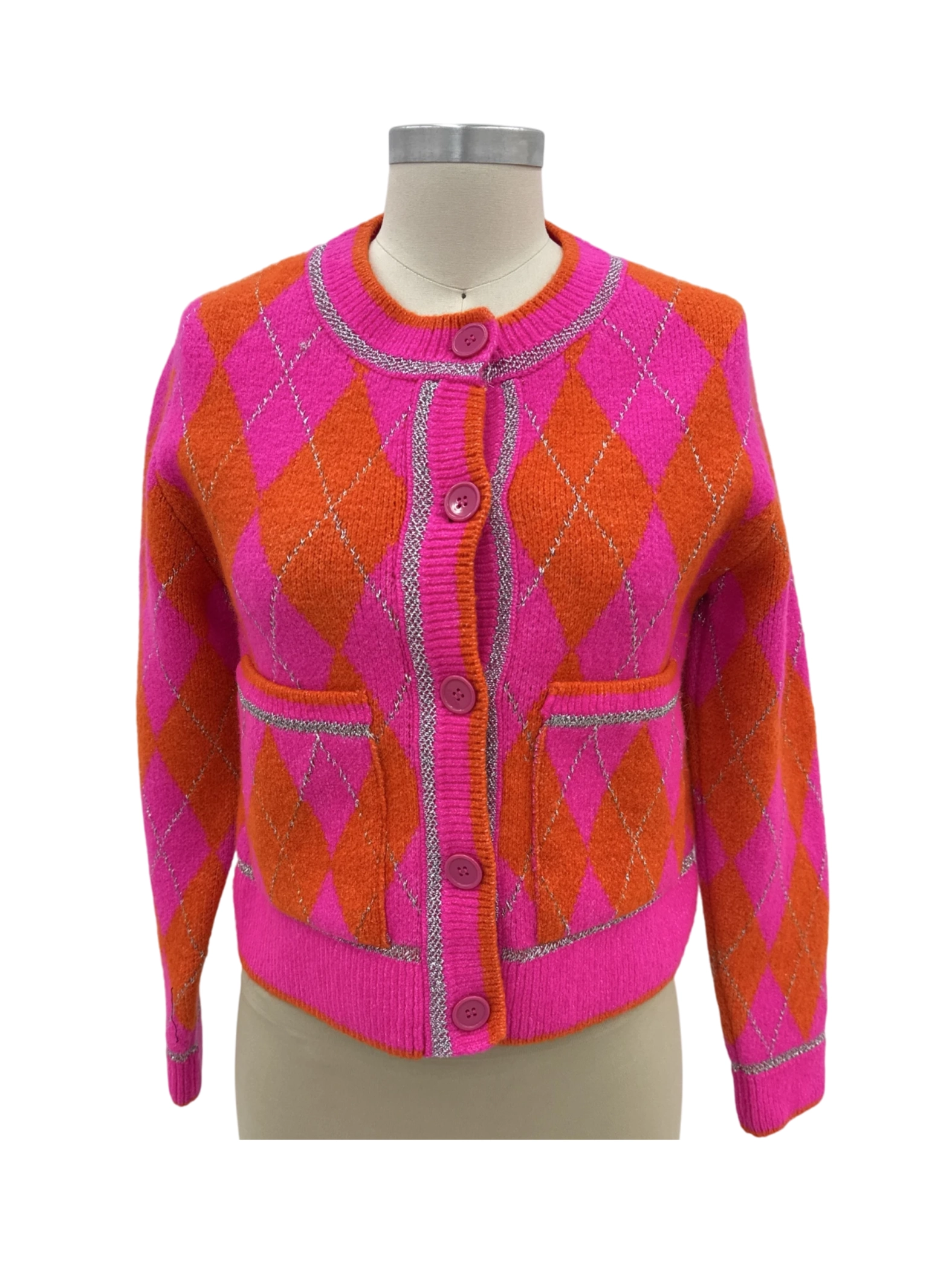 Embrace a pop of color with this vibrant, pre-owned ZARA cardigan. This sweater showcases a bold geometric pattern in pink and orange, perfect for adding a statement to your fall and winter wardrobe. With a classic round neck and button-up closure, it offers both style and comfort. Crafted from a blend of acrylic and polyester, this cardigan is a versatile addition to any collection. Don't miss out on this stylish pre-loved piece!