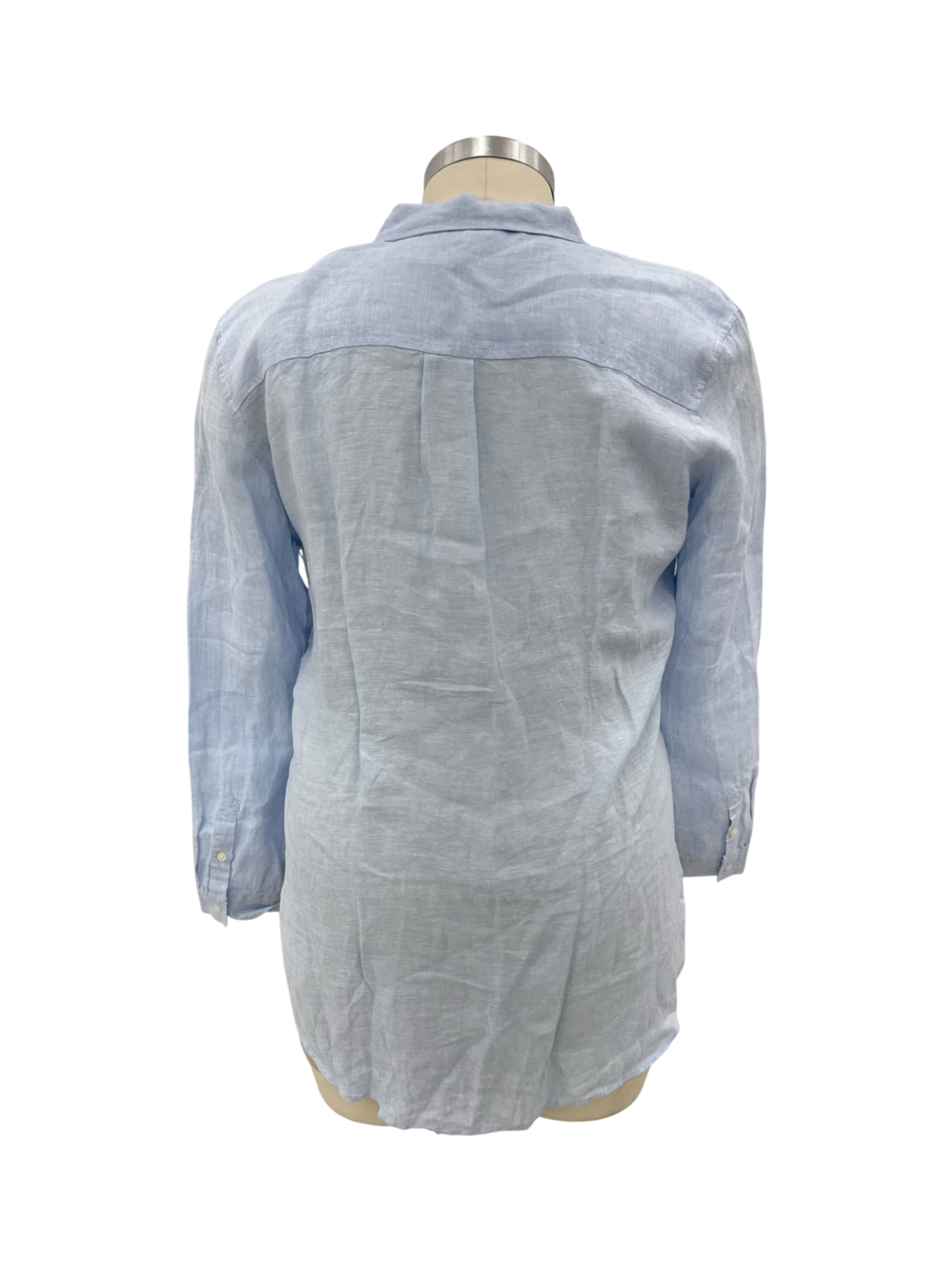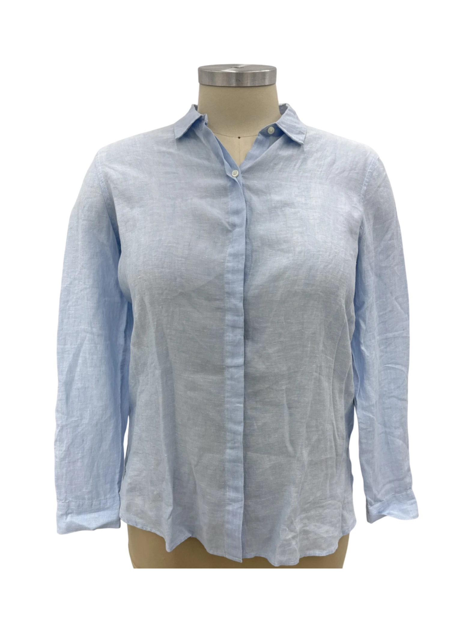 Elevate your wardrobe with this gently used Pure Navy button-up blouse, perfect for a chic and relaxed summer look. Crafted from breathable linen fabric in a soothing light blue hue. This versatile top features a classic collar and long sleeves. Ideal for both casual and semi-formal occasions, it offers comfort and style. A sustainable choice, this blouse combines quality, comfort, and timeless design at an affordable price, ensuring you look and feel your best. - Elevate your wardrobe with this stylish Pure Navy women's blouse. Crafted from breathable linen in a calming blue hue, this top is perfect for warm weather. This second-hand blouse features a classic button-up design, collared neckline, and long sleeves for a versatile look. The relaxed fit makes it comfortable for casual outings or a day at the office. This is a must have for any wardrobe.