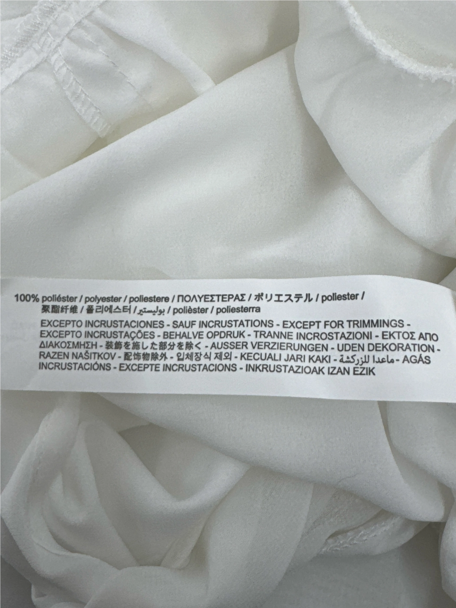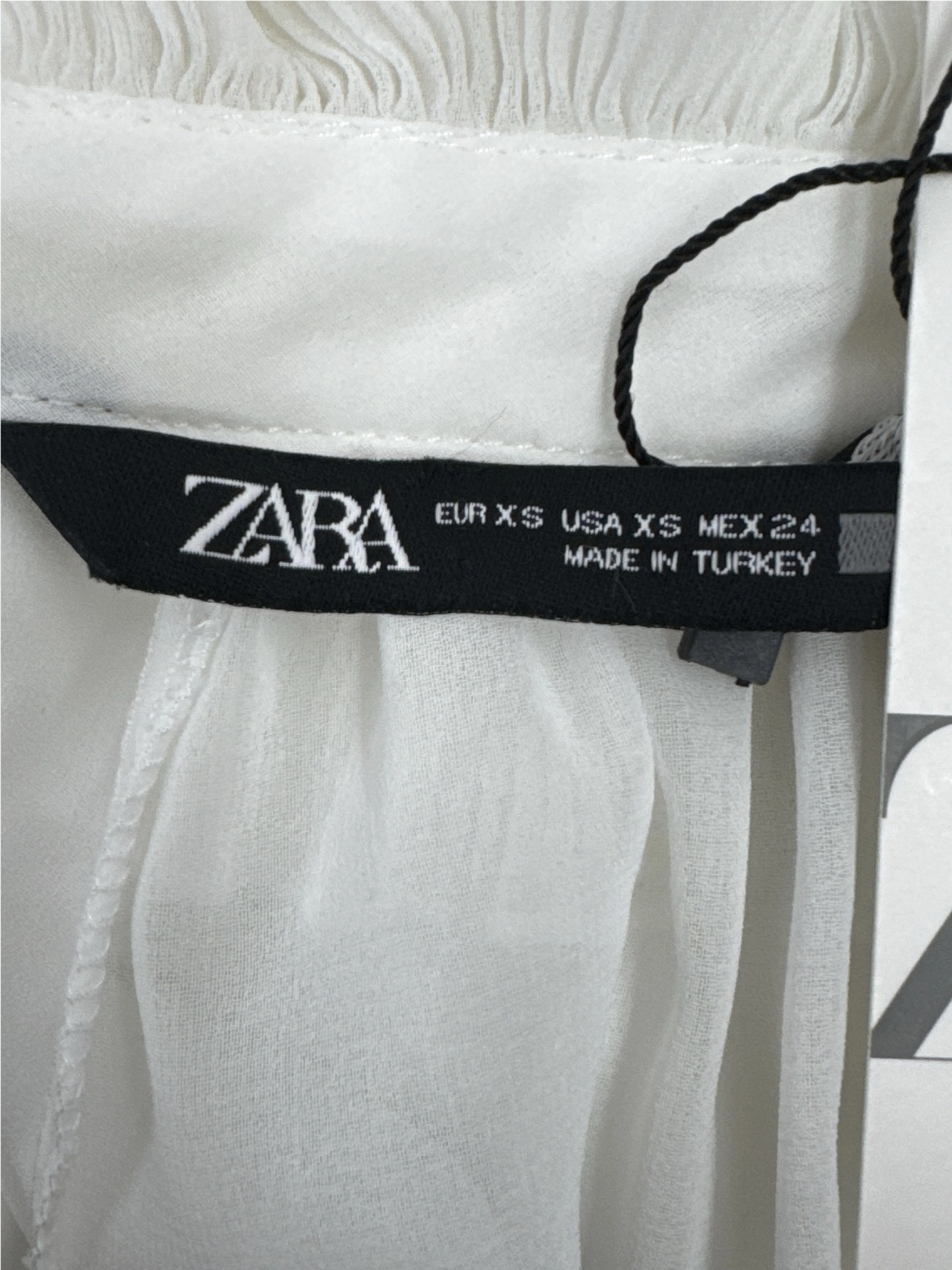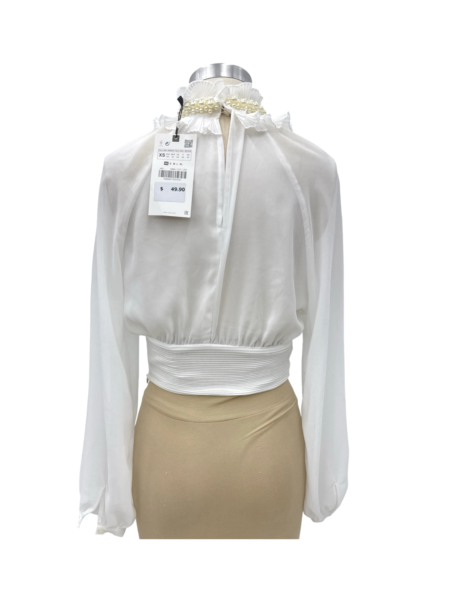 Elevate your wardrobe with this exquisite pre-owned Zara blouse. Featuring a delicate round neck and elegant long sleeves, this top is perfect for any occasion. Crafted from 100% polyester, it offers a comfortable fit and a touch of sophistication. The lightweight fabric and versatile design make it ideal for layering or wearing on its own. A timeless piece that will complement any outfit and season, making it a must-have in your closet.