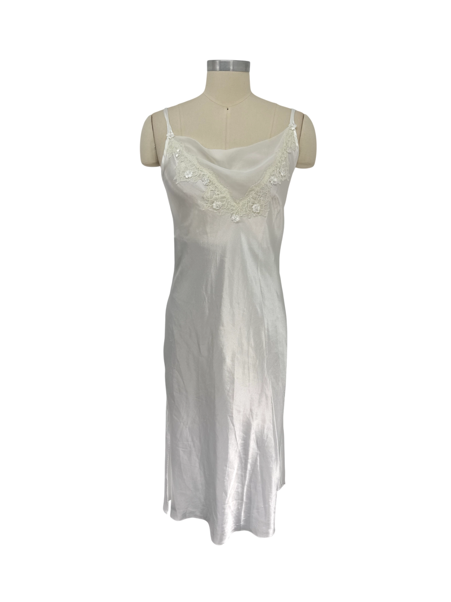 This vintage Oscar de la Renta slip dress, featuring delicate lace detailing and a flattering silhouette, is a luxurious addition to any lingerie collection. Crafted from soft and silky polyester, this slip offers both comfort and elegance. Perfect for layering or wearing on its own, it's a timeless piece that adds a touch of vintage glamour to your wardrobe. Ideal for warm weather or special occasions.