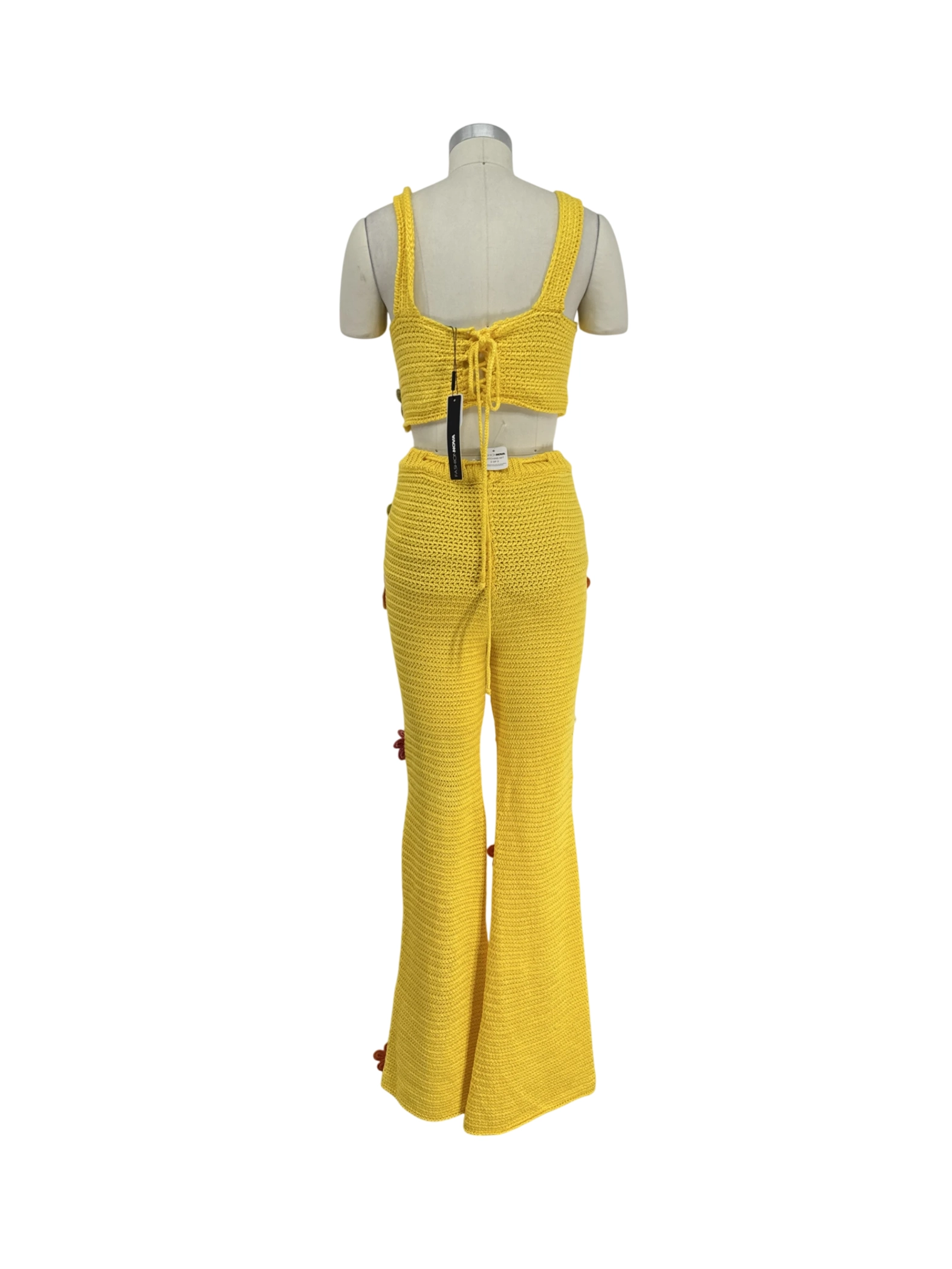 Elevate your summer wardrobe with this vibrant, pre-owned Fashion Nova set. This eye-catching two-piece ensemble features a stylish crop top and flared pants, beautifully adorned with delicate floral appliques. The bright yellow color is perfect for sunny days, while the comfortable acrylic and polyester blend ensures a soft feel. This set is designed for a flattering fit. The intricate crochet adds a touch of bohemian charm, making it ideal for festivals, vacations, or casual outings.