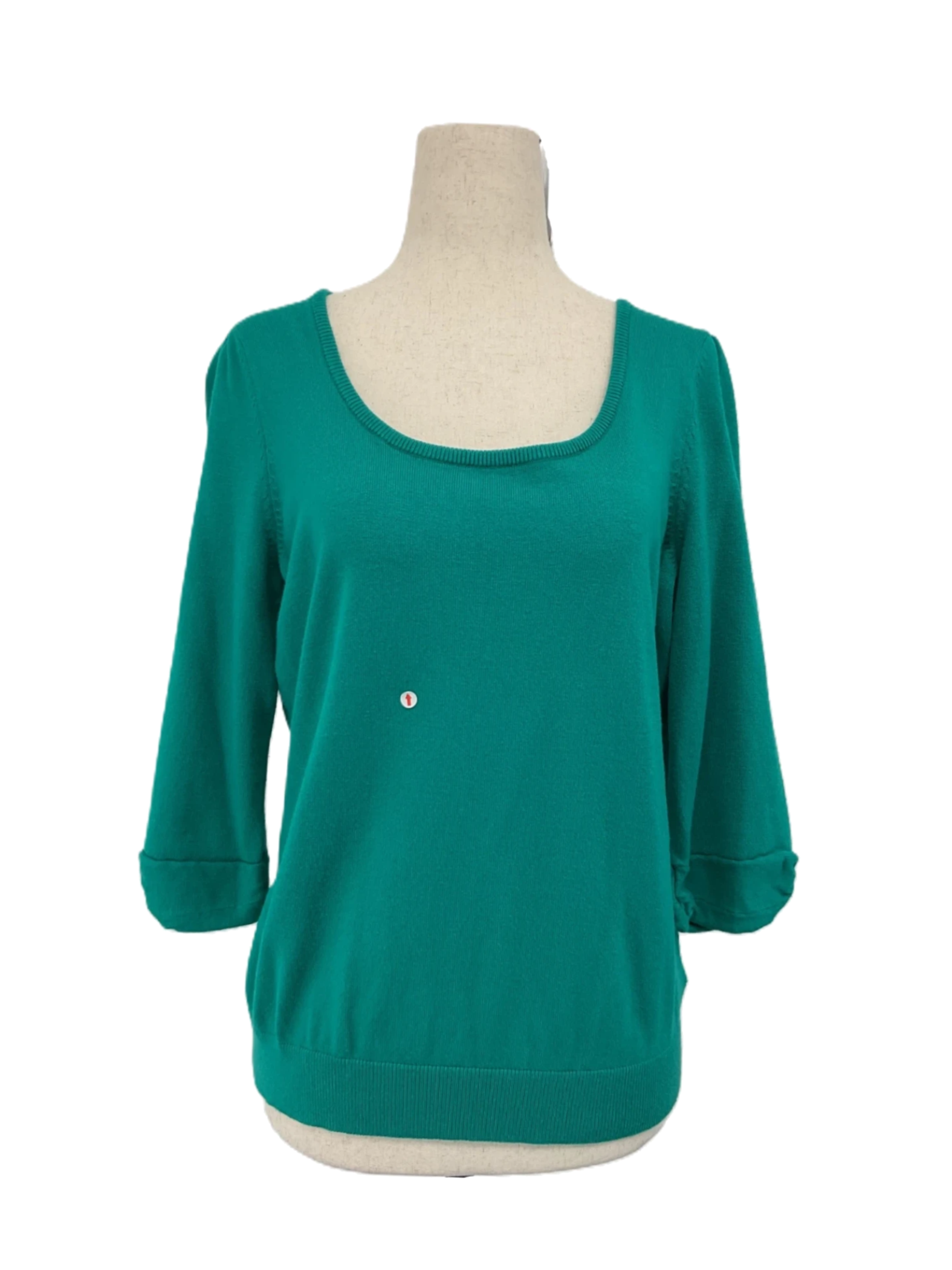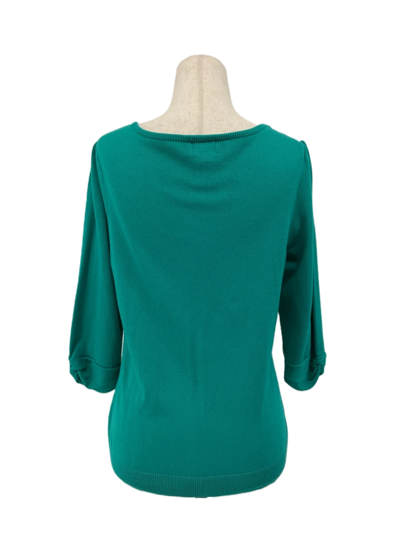 This is a women's teal 3/4 sleeve blouse in size Petite. There is a small blemish on the product, indicated by the arrow in the picture.