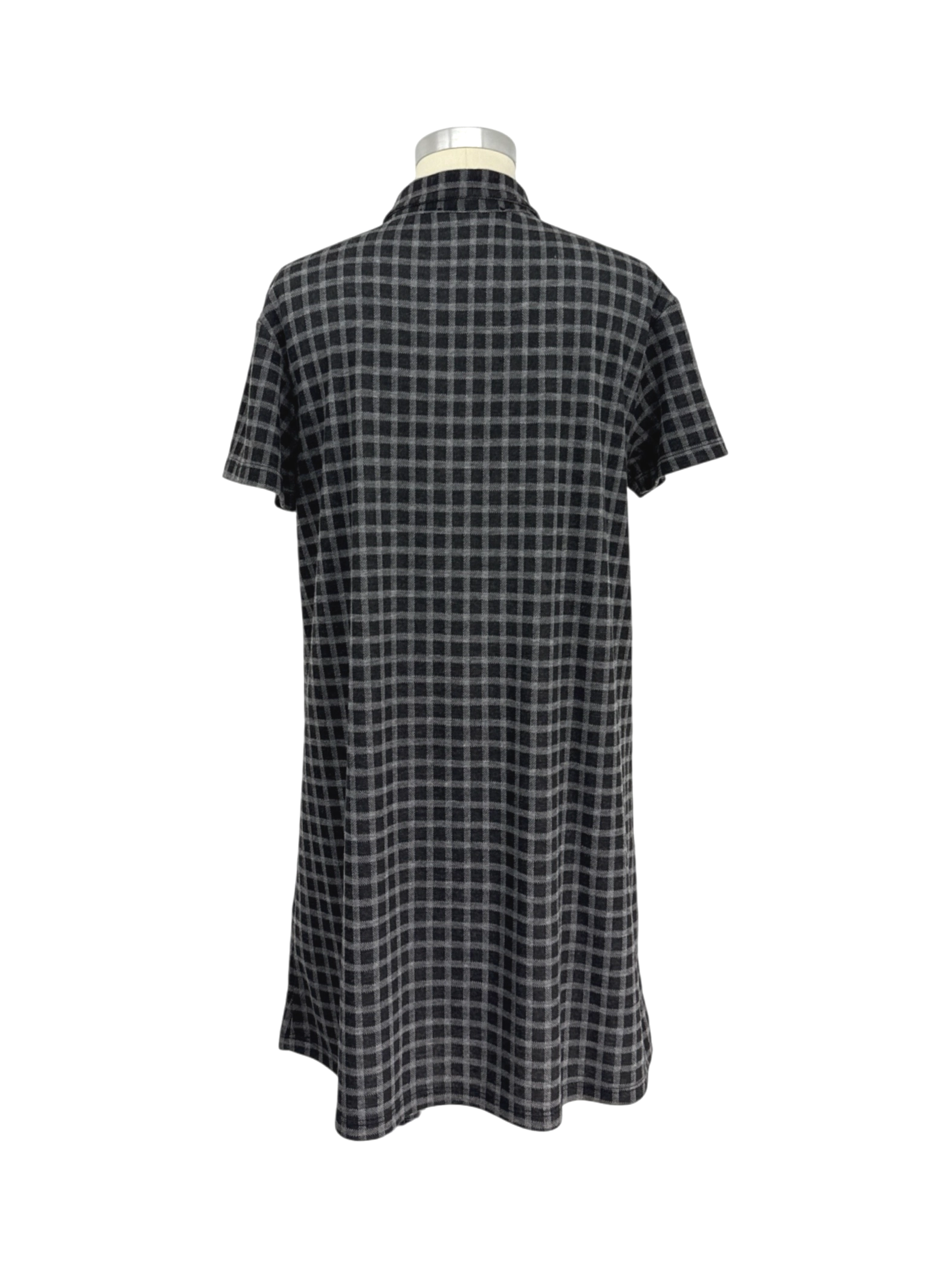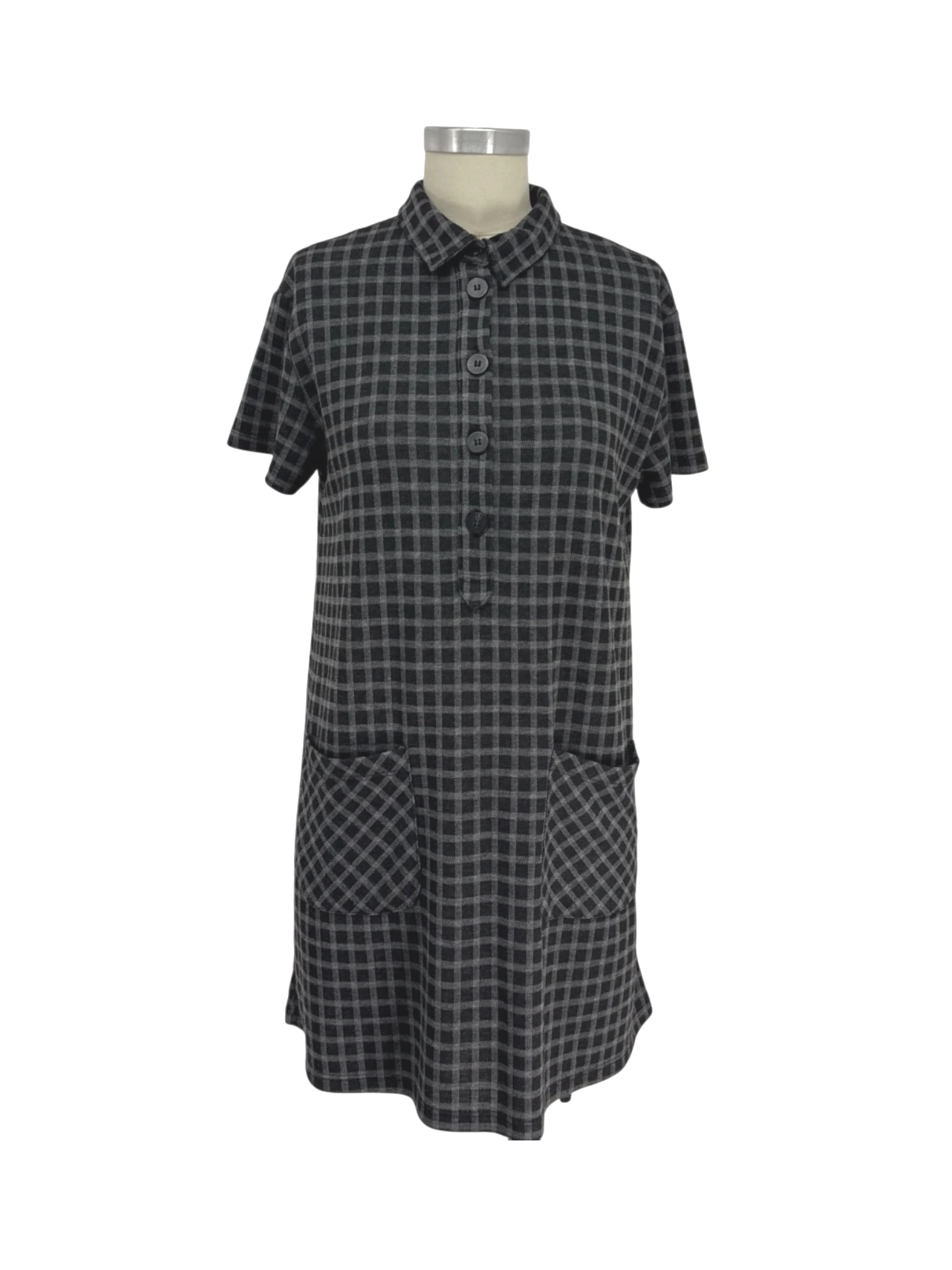 A fashionable grey and black plaid shift dress for girls featuring a classic windowpane pattern, a collared neck, a button placket, and front pockets.