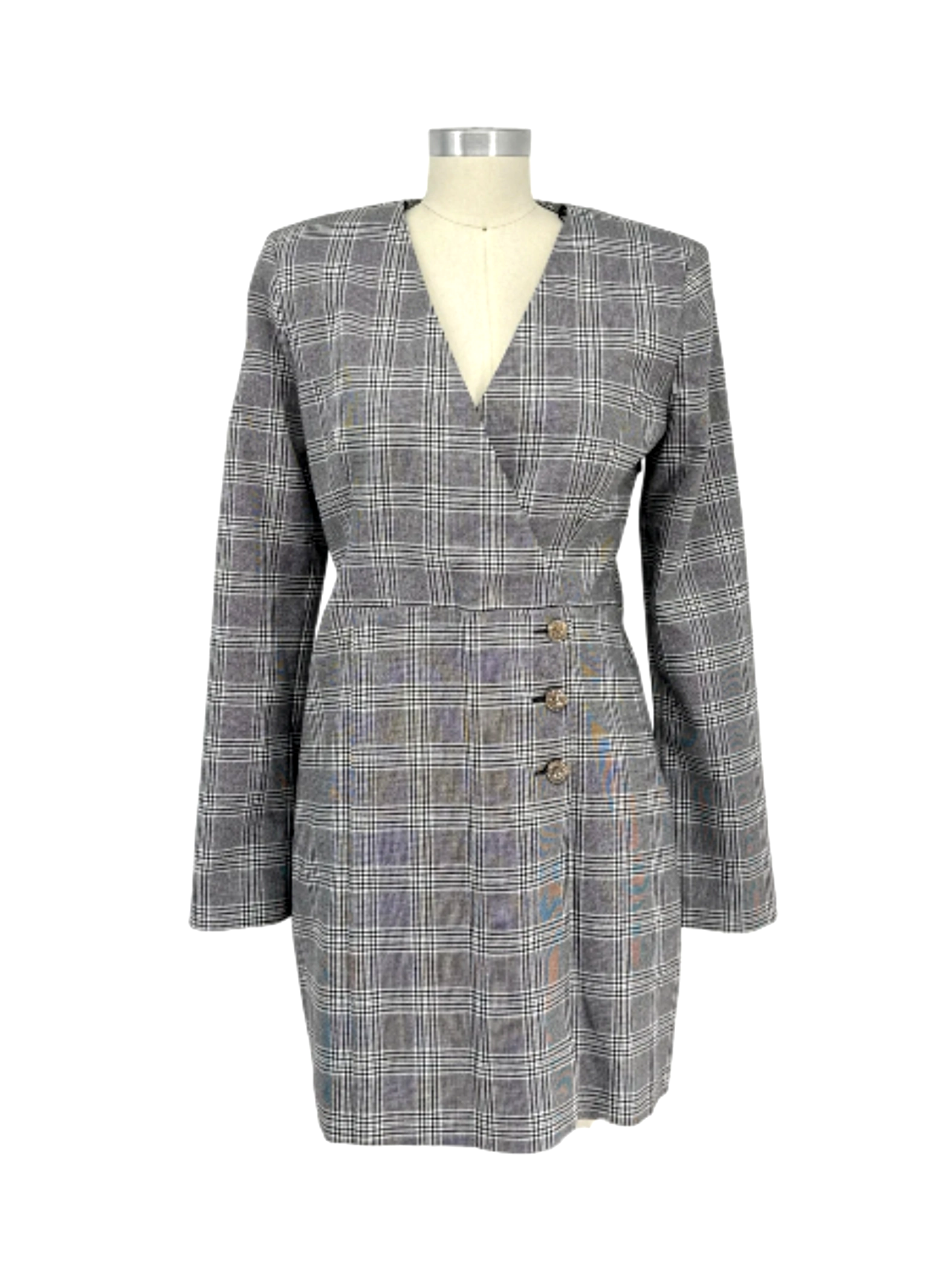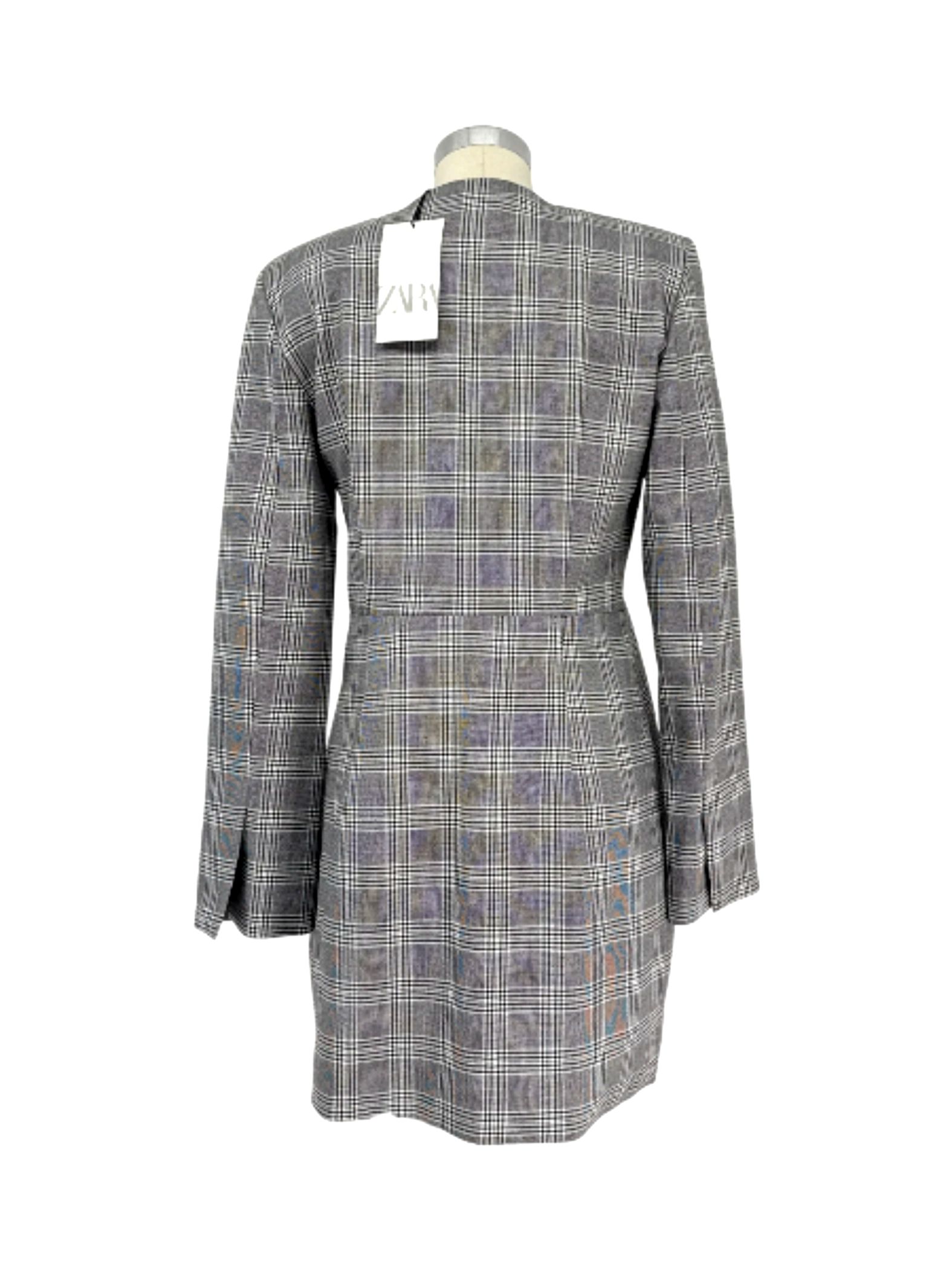 A chic, pre-owned Zara dress perfect for fall and winter. This stylish A-line mini dress features a classic plaid pattern in gray tones. The dress is designed with long sleeves, a flattering V-neckline, and decorative buttons, suitable for casual outings. The dress has a sheath silhouette with a mini skirt length. It's made of polyester. A timeless piece that combines comfort and elegance.