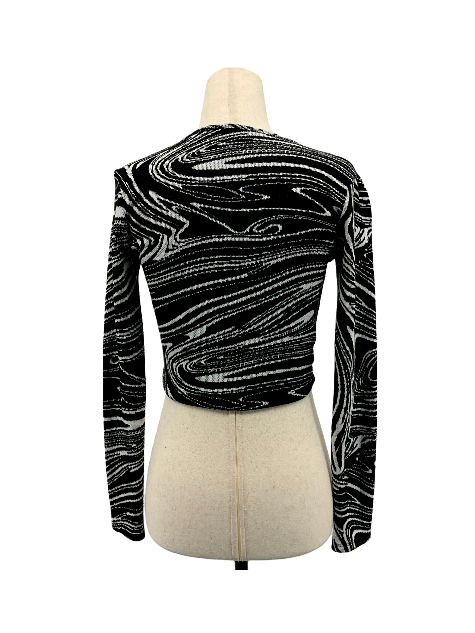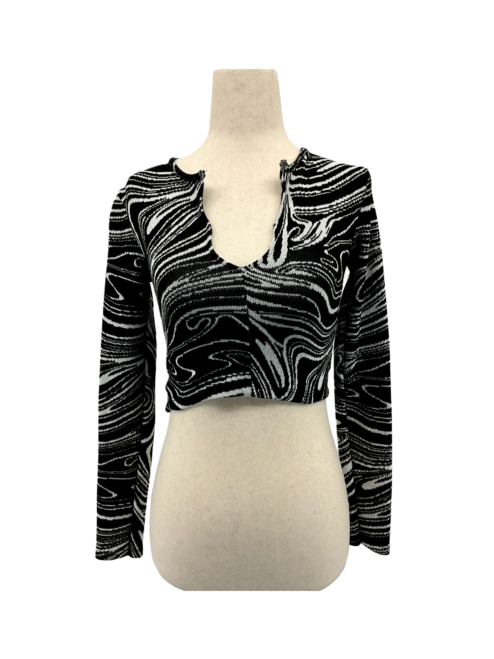 Elevate your wardrobe with this stylish ZARA sweater. This cropped sweater features a unique black and white stripe pattern, perfect for adding a touch of personality to any outfit. Made from a comfortable blend of polyester, viscose, and spandex, this sweater is ideal for spring or fall. With a flattering V-neckline, it's a versatile piece that can be dressed up or down. A pre-owned find that offers both comfort and style!
