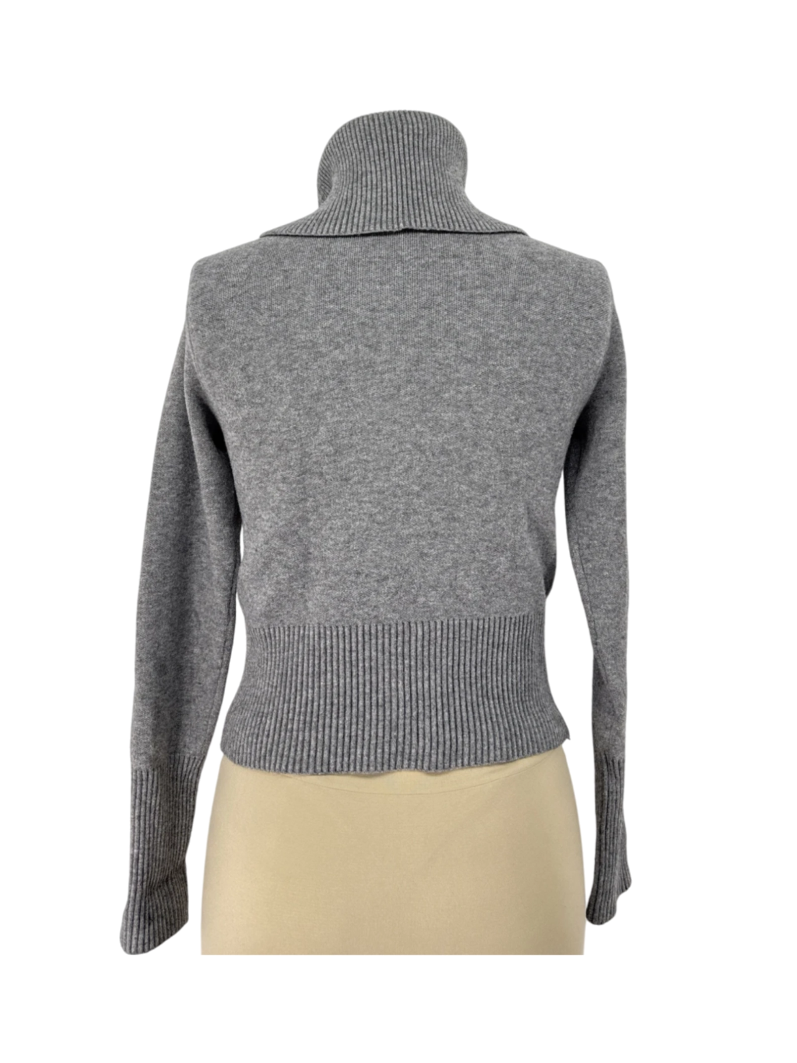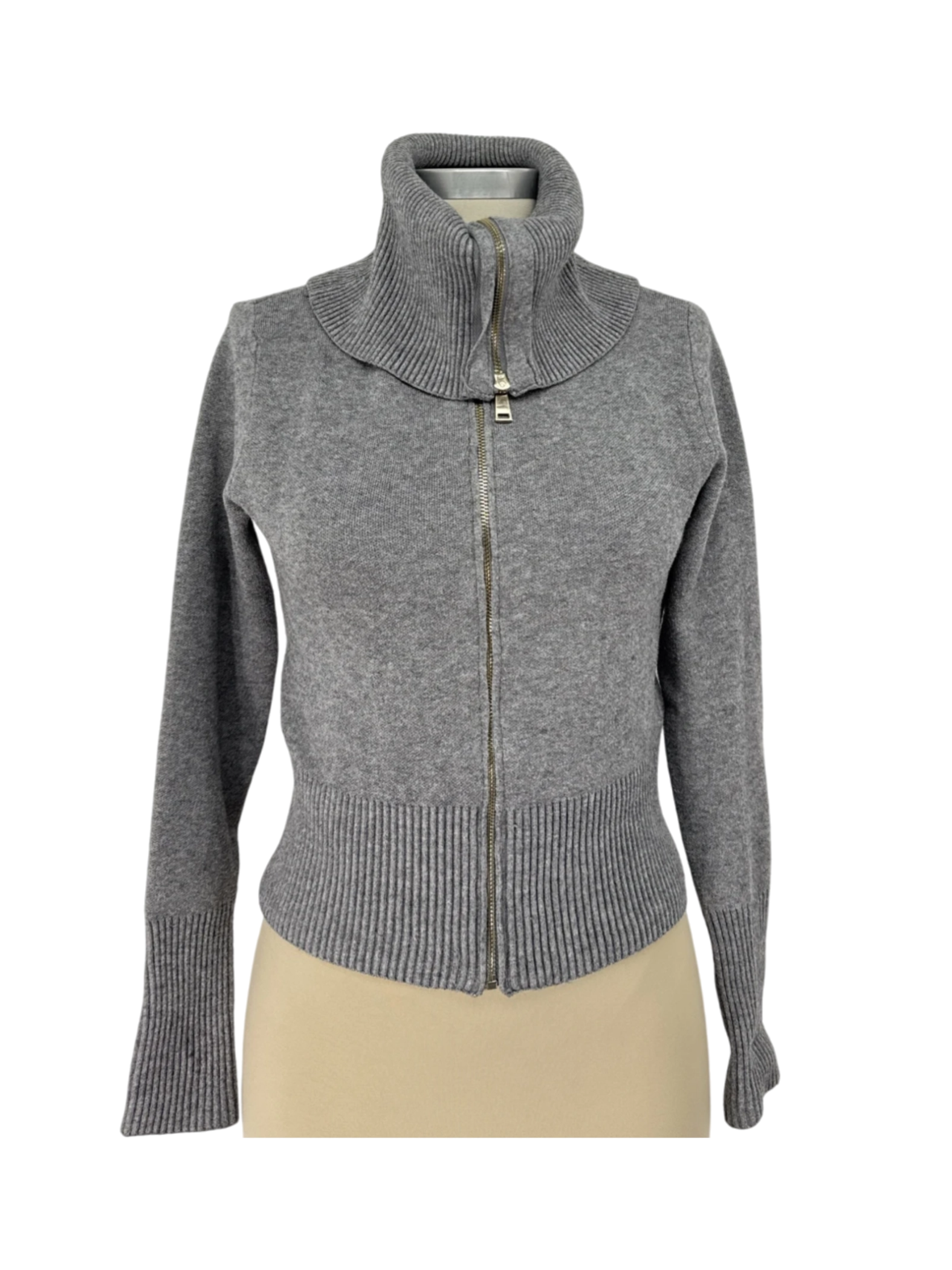 This stylish, pre-owned ZARA Knit cardigan is the perfect addition to any wardrobe. Crafted from a cozy material, this sweater features a sleek gray color and a comfortable turtleneck. The full zipper closure adds a touch of modern flair, while the versatile design makes it ideal for layering. Great for cooler weather, this cardigan will keep you warm and fashionable.