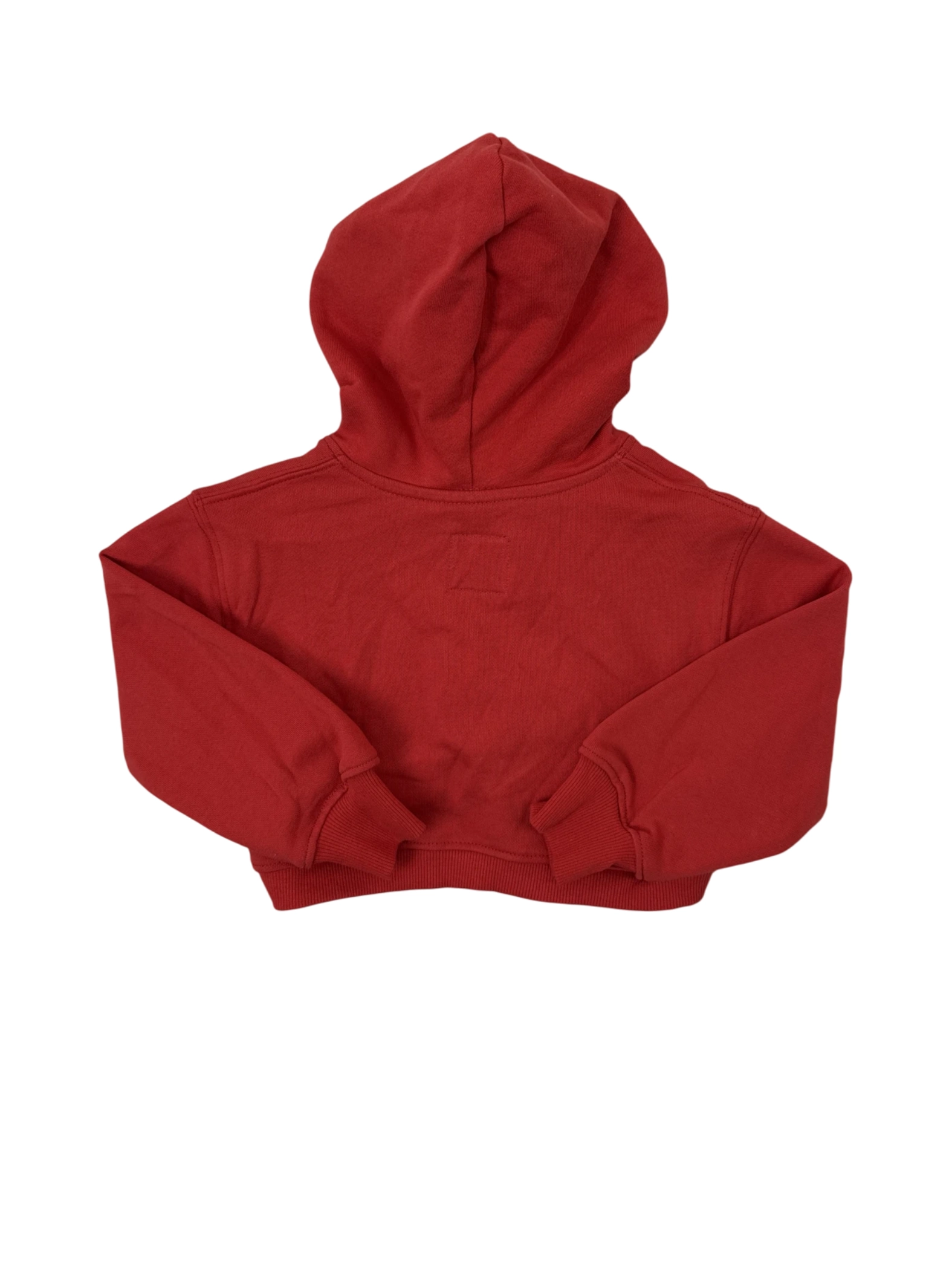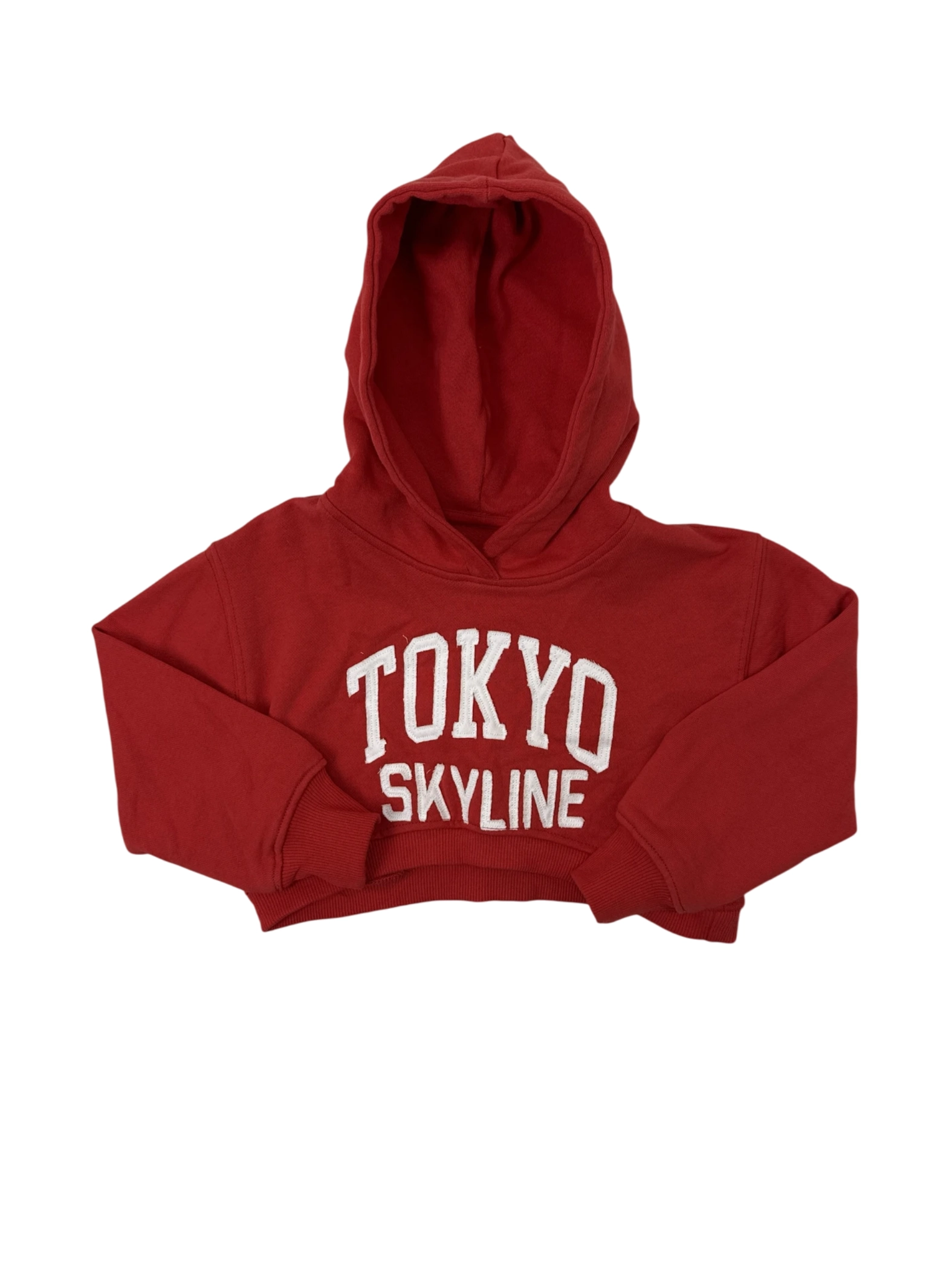 Cropped hoodie - This pre-owned ZARA red hooded sweatshirt for girls is a stylish and comfortable addition to any wardrobe. Featuring a 'TOKYO SKYLINE' graphic, this cropped hoodie offers a trendy look. It is made from a blend of materials, perfect for layering in colder months. Ideal for casual wear, school, or outings, this ZARA sweatshirt is a great find.