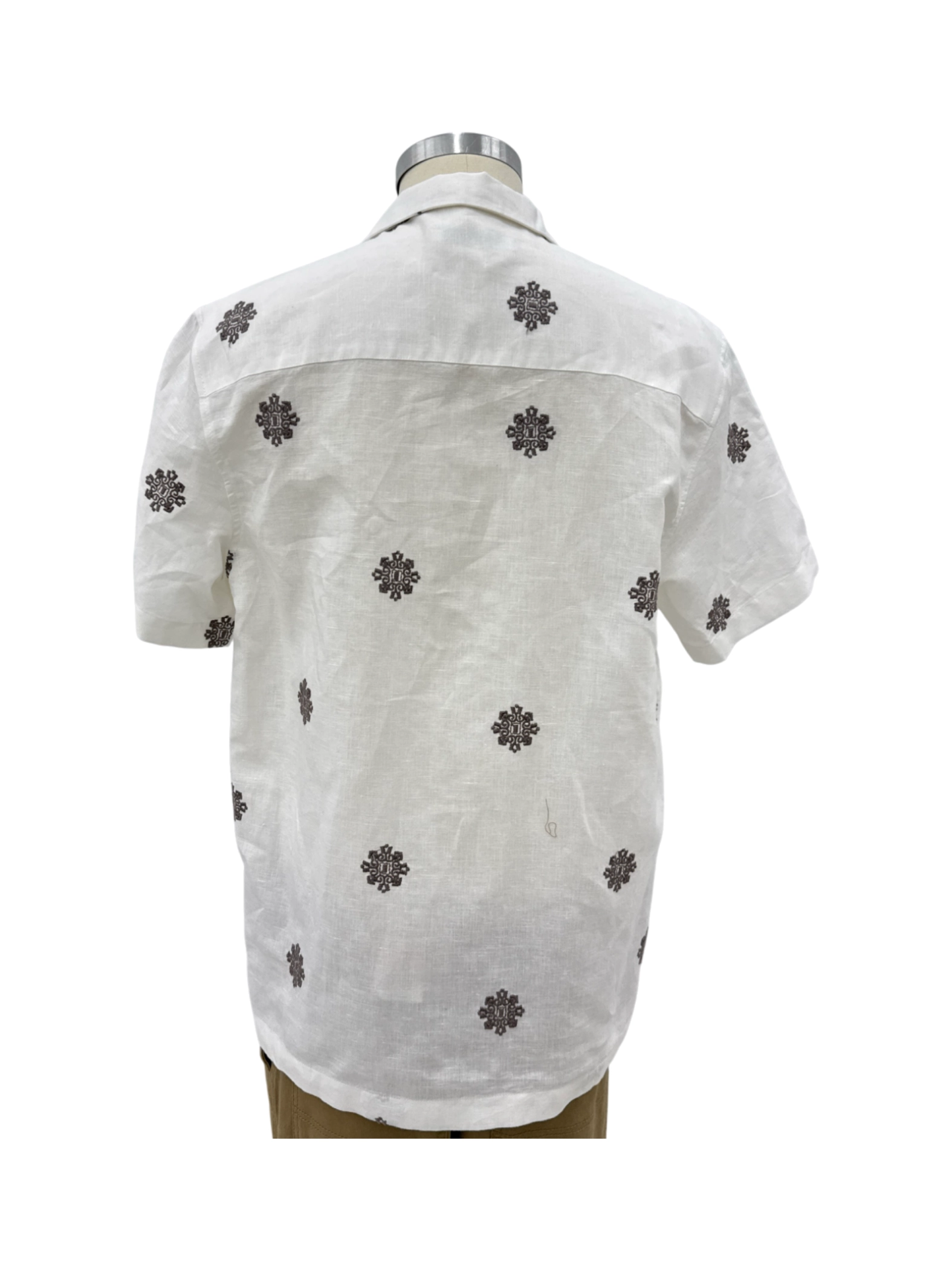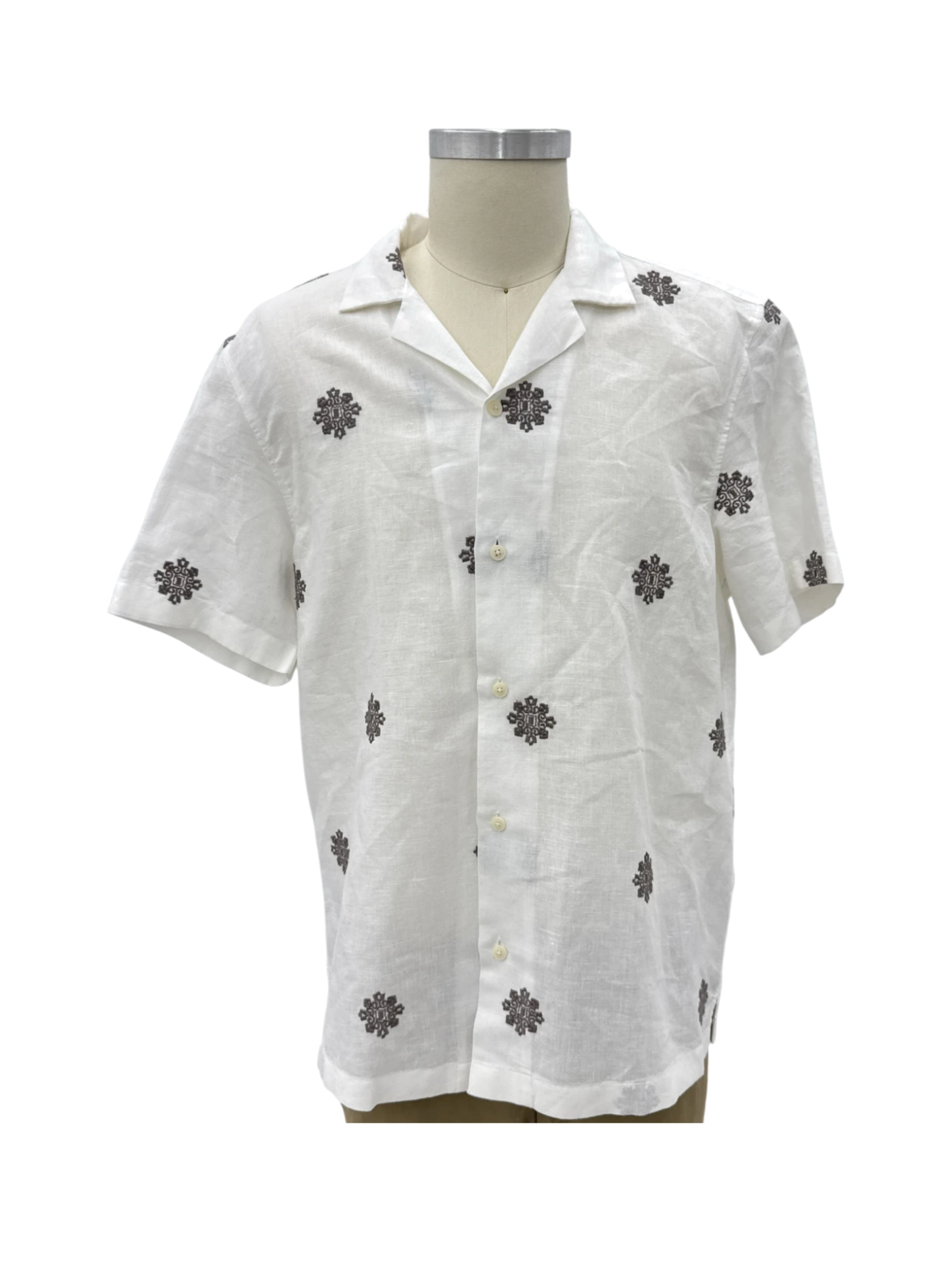 Elevate your wardrobe with this stylish pre-owned ZARA short-sleeve shirt. Crafted from a blend of linen and cotton for ultimate comfort, this shirt features a classic collar and button-up closure. The white fabric is adorned with a delicate floral pattern, perfect for adding a touch of sophistication to any outfit. Ideal for warmer seasons, this versatile shirt is a must-have addition to your collection. This pre-owned shirt offers both style and sustainability.