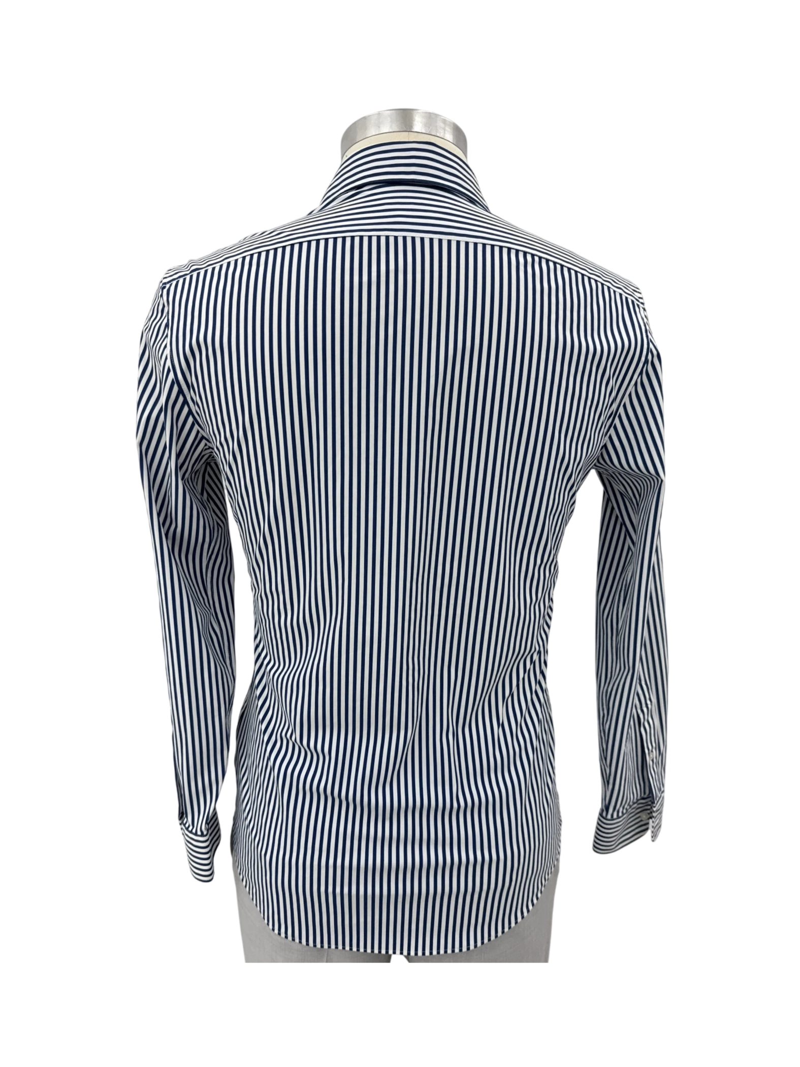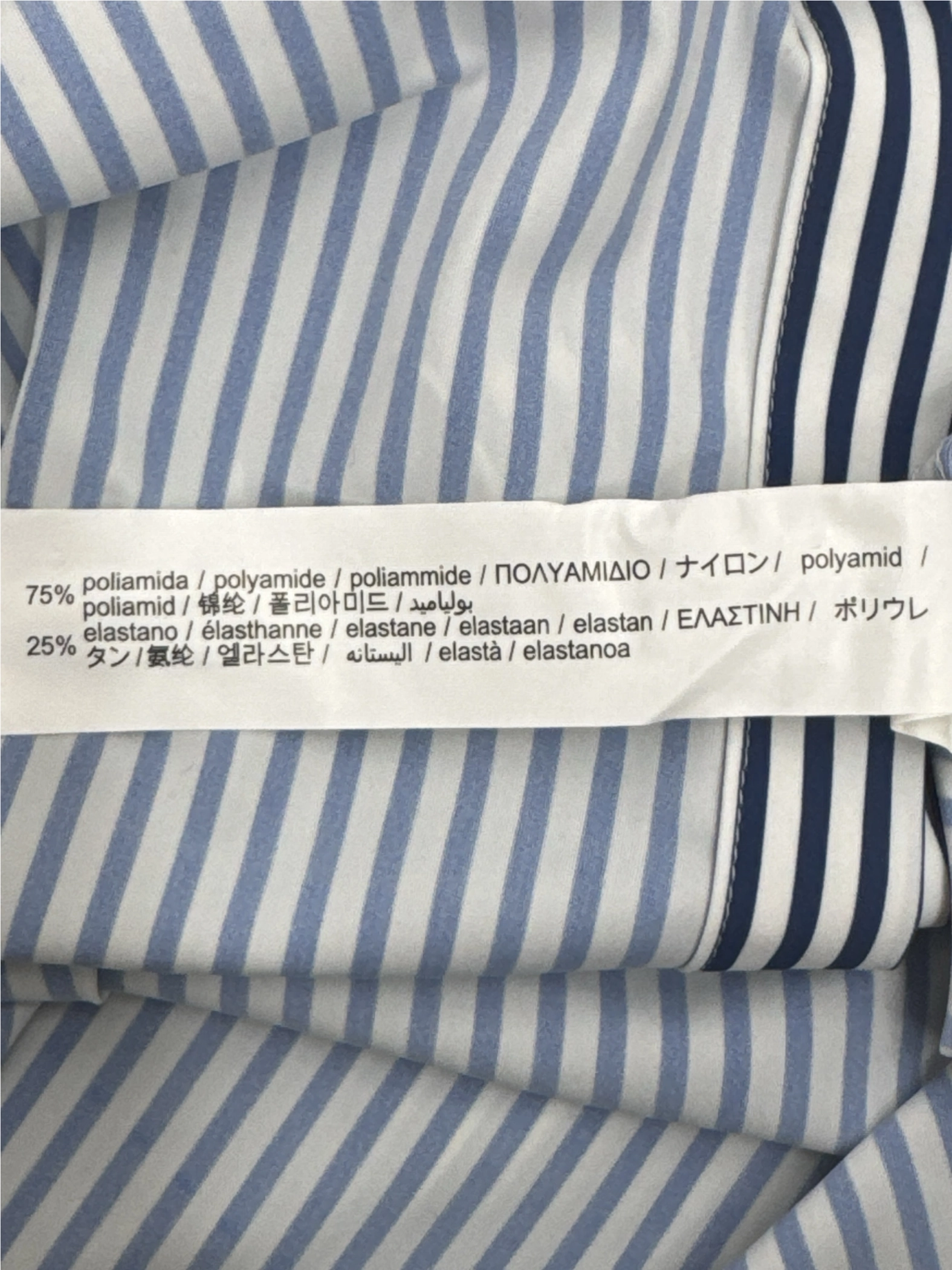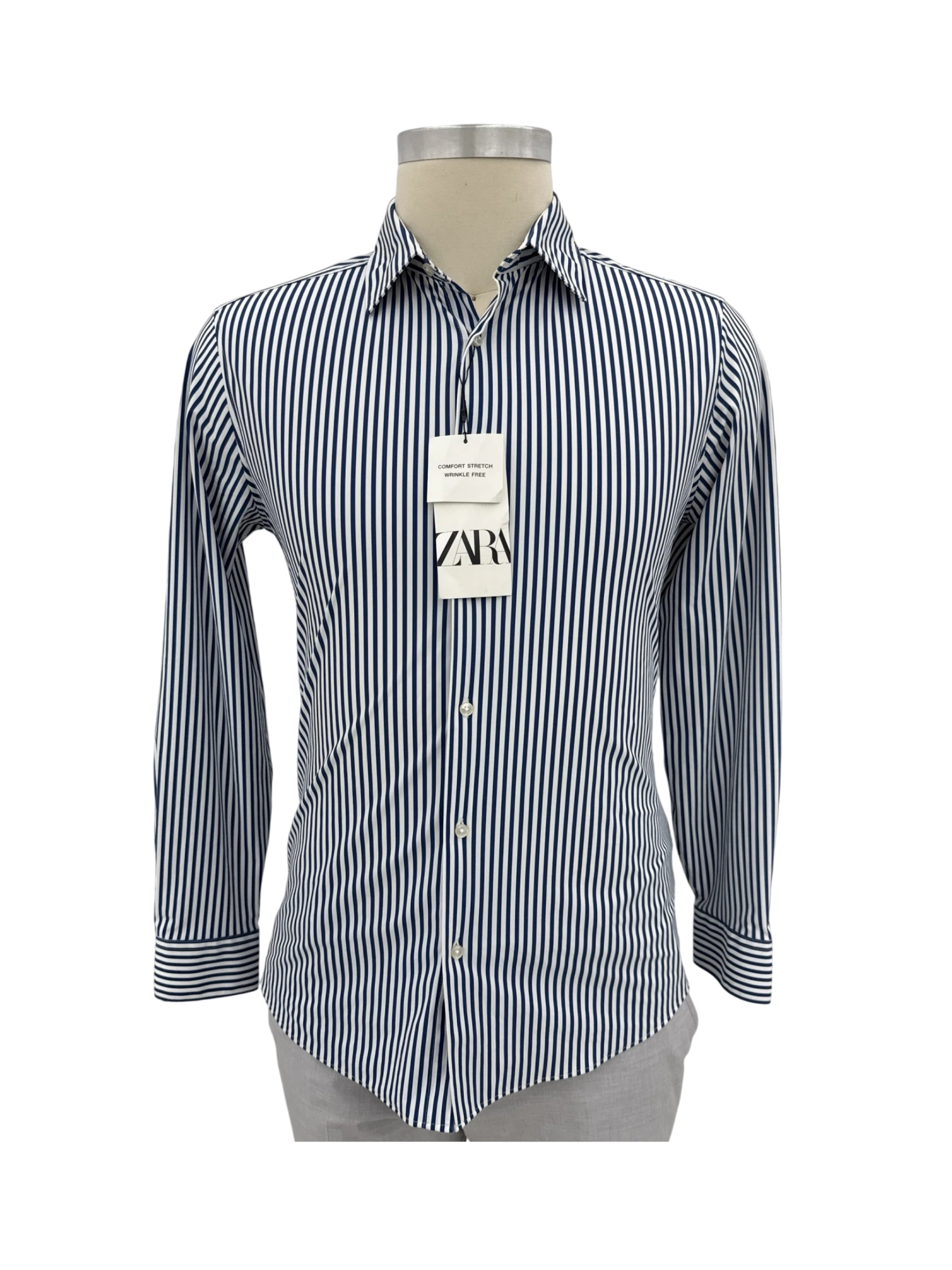 Elevate your wardrobe with this stylish second-hand ZARA men's long sleeve shirt. This shirt features a classic striped pattern in blue and white, a collared neckline, and a button-down closure. Crafted from a blend of polyamide and elastane, it offers both comfort and durability. Perfect for any season, this versatile shirt is ideal for both casual and semi-formal occasions, making it a great addition to your collection.