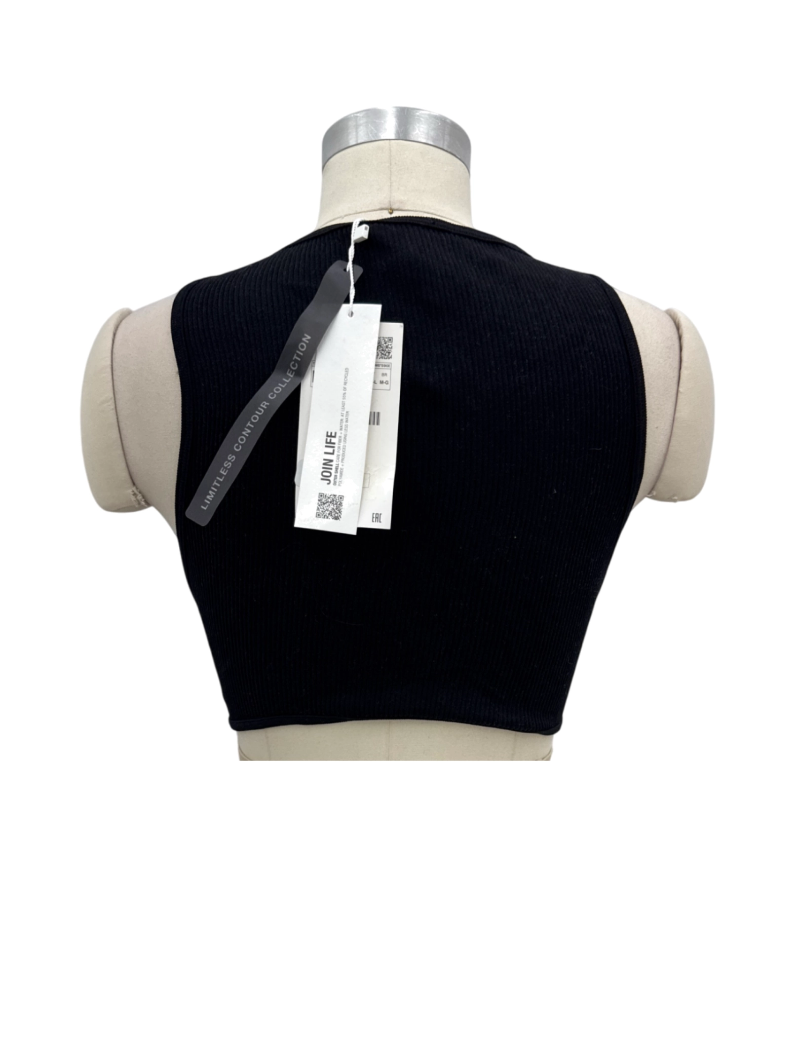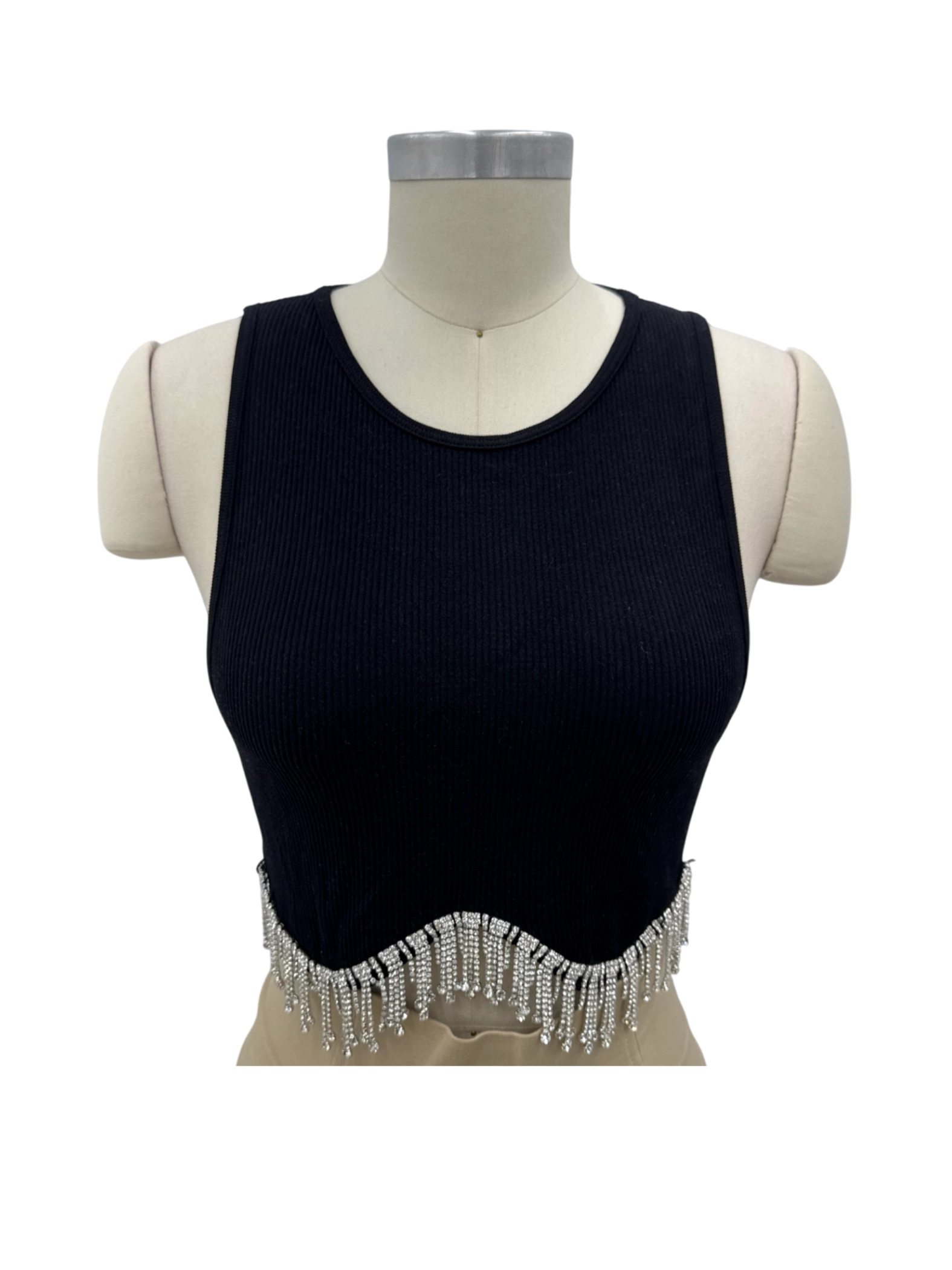 Elevate your look with this stunning Zara black tank top. This stylish top features a flattering round neckline and a sparkling embellishment adding a touch of glamour. Crafted from a comfortable blend of polyester and elastane, it's perfect for warm weather. This second-hand tank top is a versatile piece, ideal for a night out or a casual day look. It’s perfect for adding some sparkle to your wardrobe!