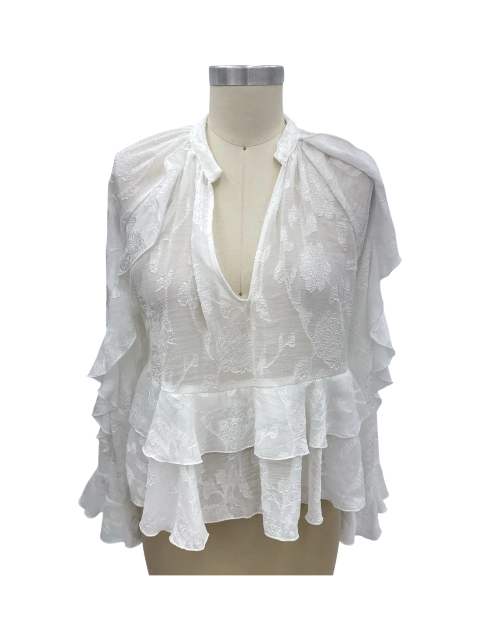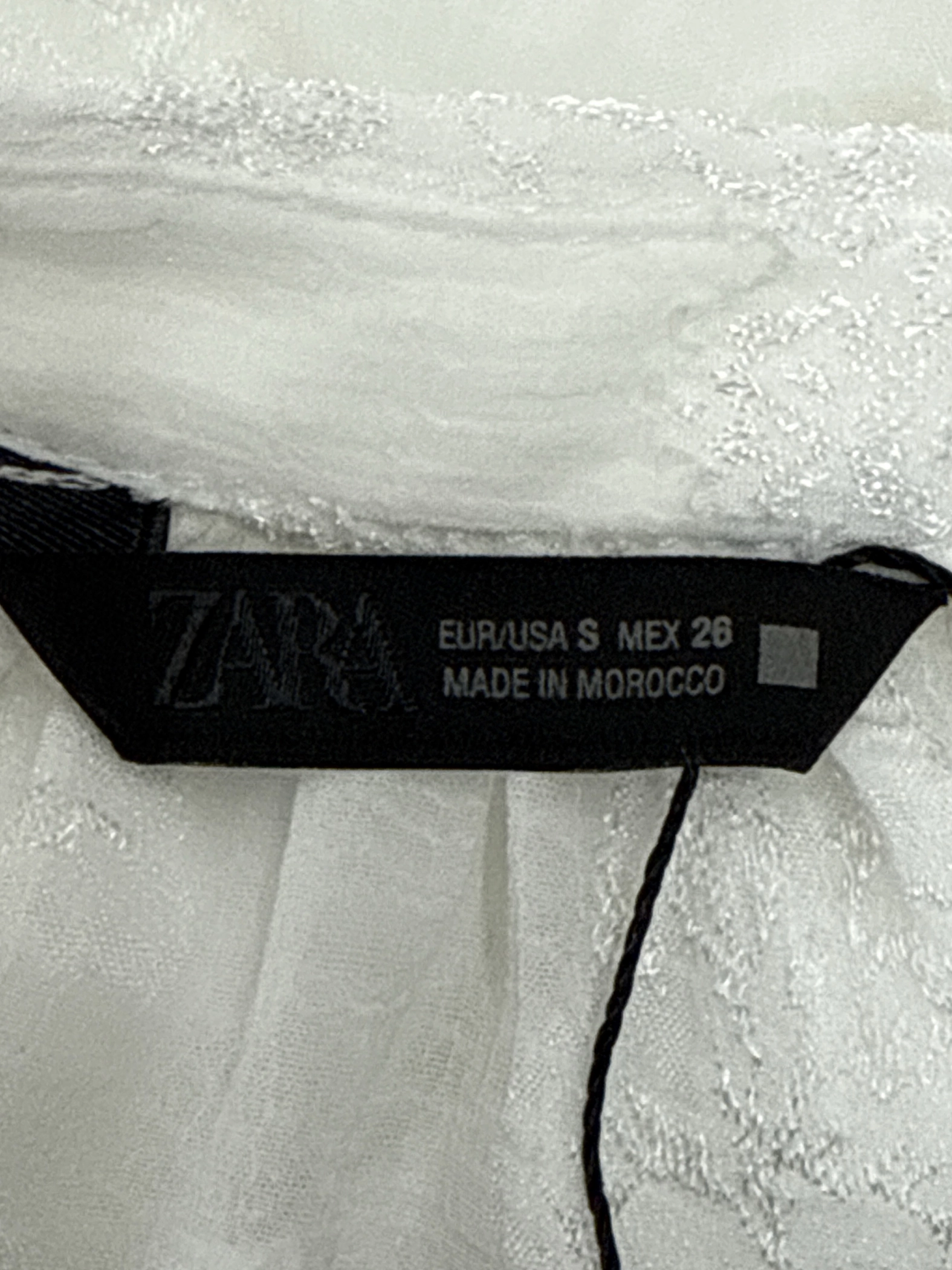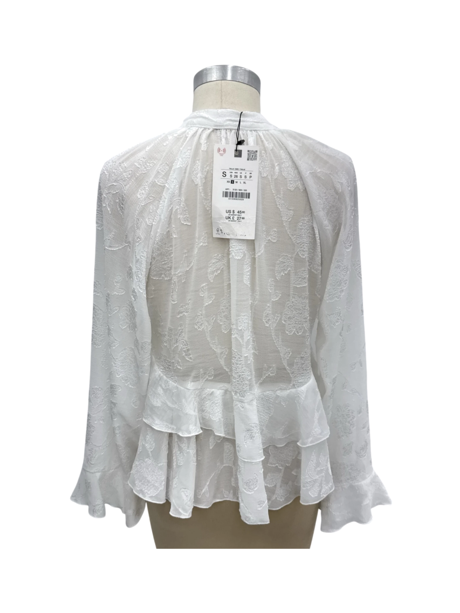 Elevate your wardrobe with this stylish pre-owned ZARA blouse. This elegant top features delicate floral embroidery, a flattering V-neck, and long sleeves, perfect for adding a touch of sophistication to any outfit. The flowy design and lightweight fabric make it ideal for warm weather. This blouse offers a blend of comfort and style. A versatile piece that can be dressed up or down, making it a great addition to your collection.
