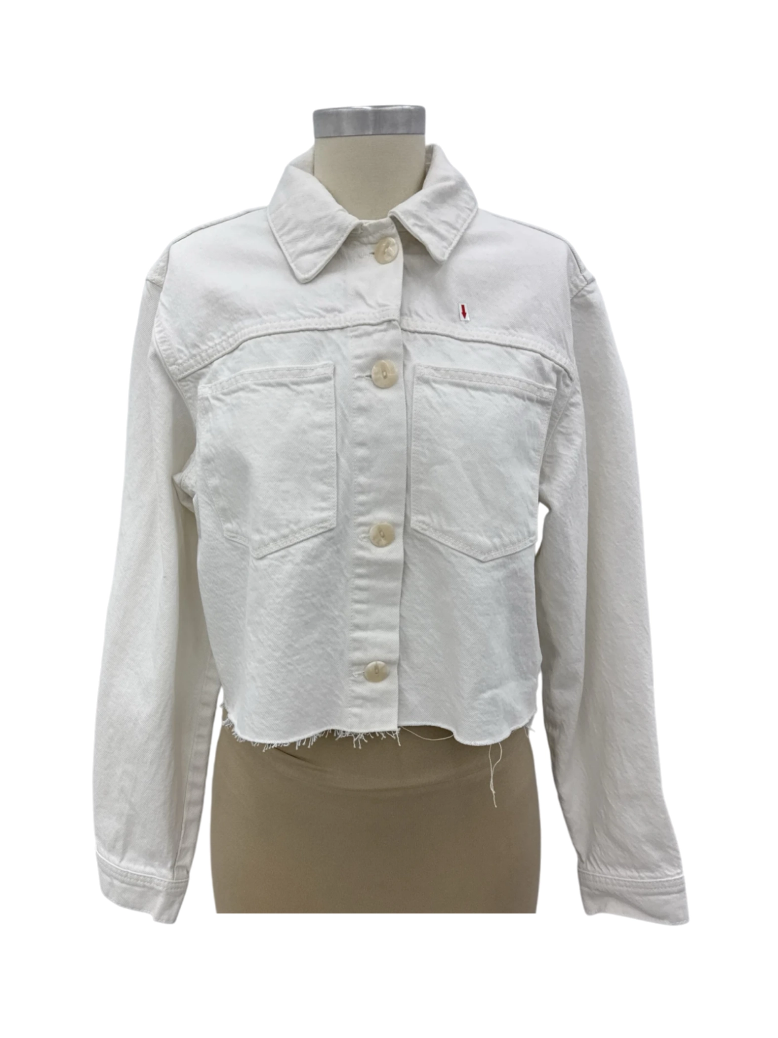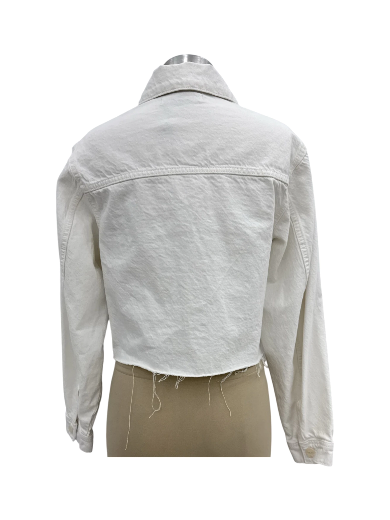Elevate your wardrobe with this stylish pre-owned Zara white denim jacket. This classic jacket features a cropped silhouette, perfect for layering over your favorite outfits. Crafted from 100% cotton, it offers both comfort and durability. The versatile design makes it ideal for spring and fall, easily transitioning from day to night. Add a touch of casual chic to your look with this timeless piece. Great for everyday wear or a night out. This jacket has a modern, minimalist design.