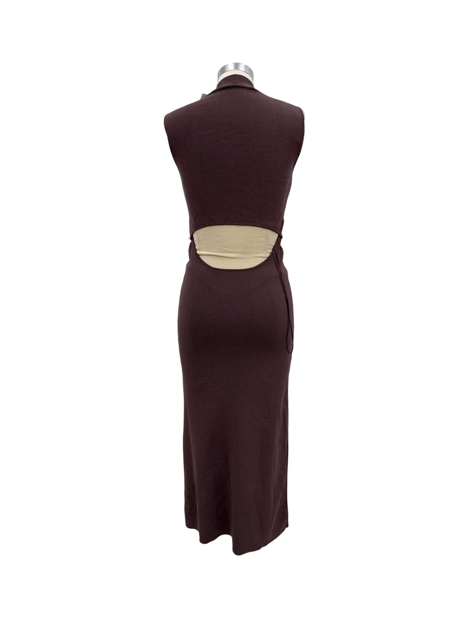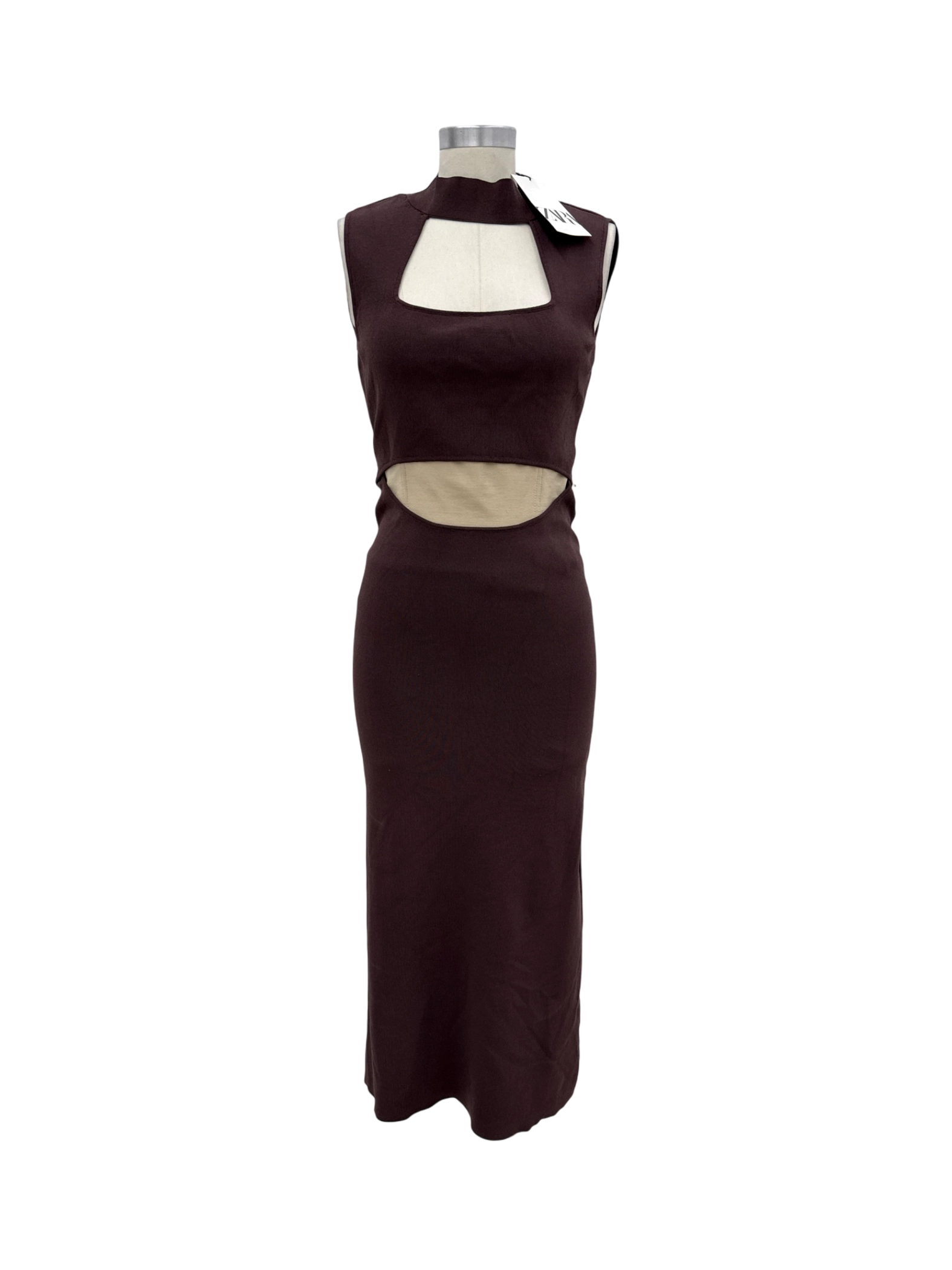 Elevate your wardrobe with this stylish pre-owned ZARA cutout bodycon dress in a rich brown hue. Featuring a unique cutout design, this dress offers a modern and chic look. Perfect for cocktail parties or a night out. This dress is crafted from a blend of polyamide and viscose, providing a comfortable and flattering fit. Its midi length and sleeveless design make it suitable for autumn and winter.