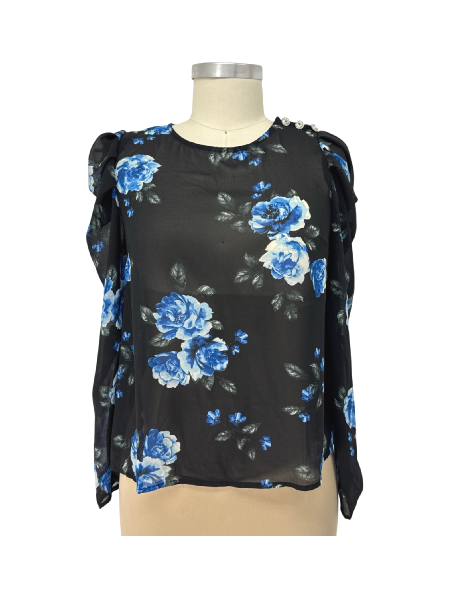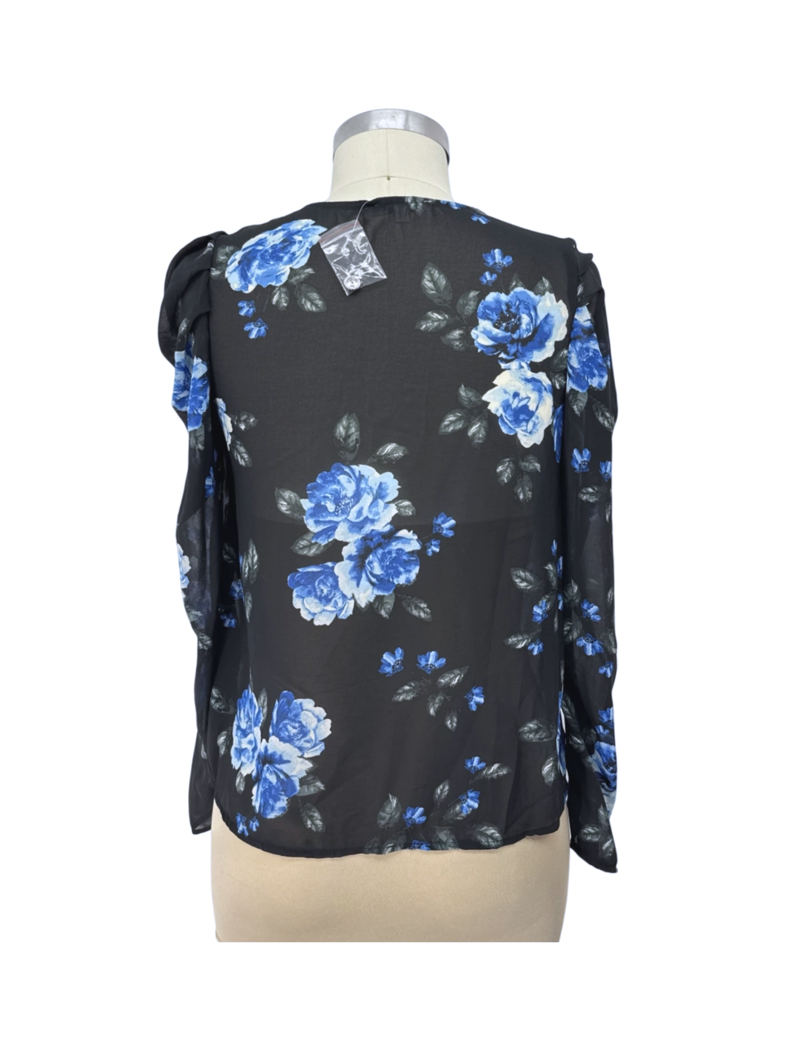 This beautiful pre-owned Zoe and Claire blouse features a stunning floral pattern of blue flowers on a black background. The long sleeves and round neckline make it a versatile piece for spring, summer, and fall. Made from lightweight and breathable polyester, this blouse is perfect for a day out or a casual evening. Pair it with jeans, skirts, or shorts for a chic and feminine look.