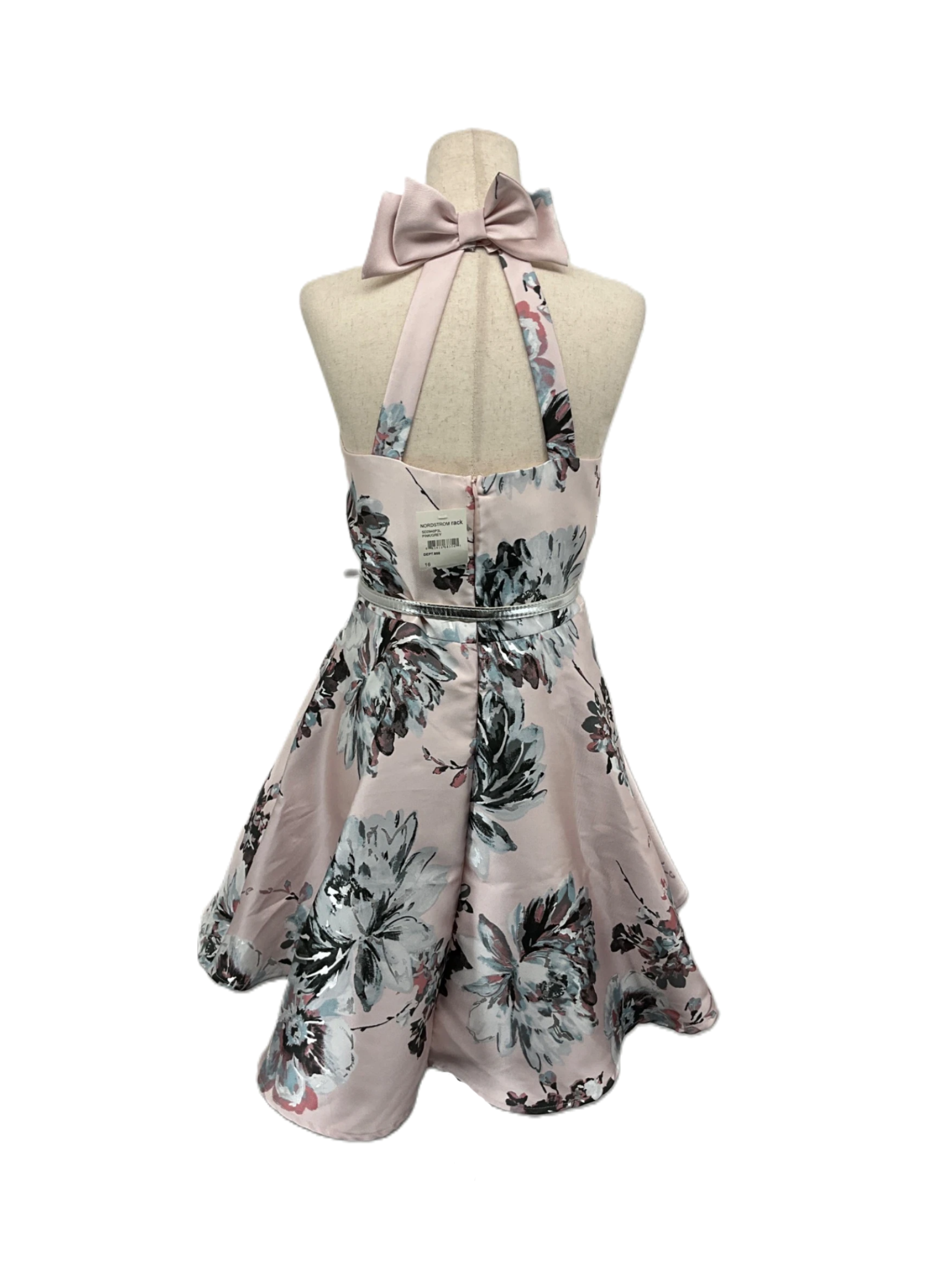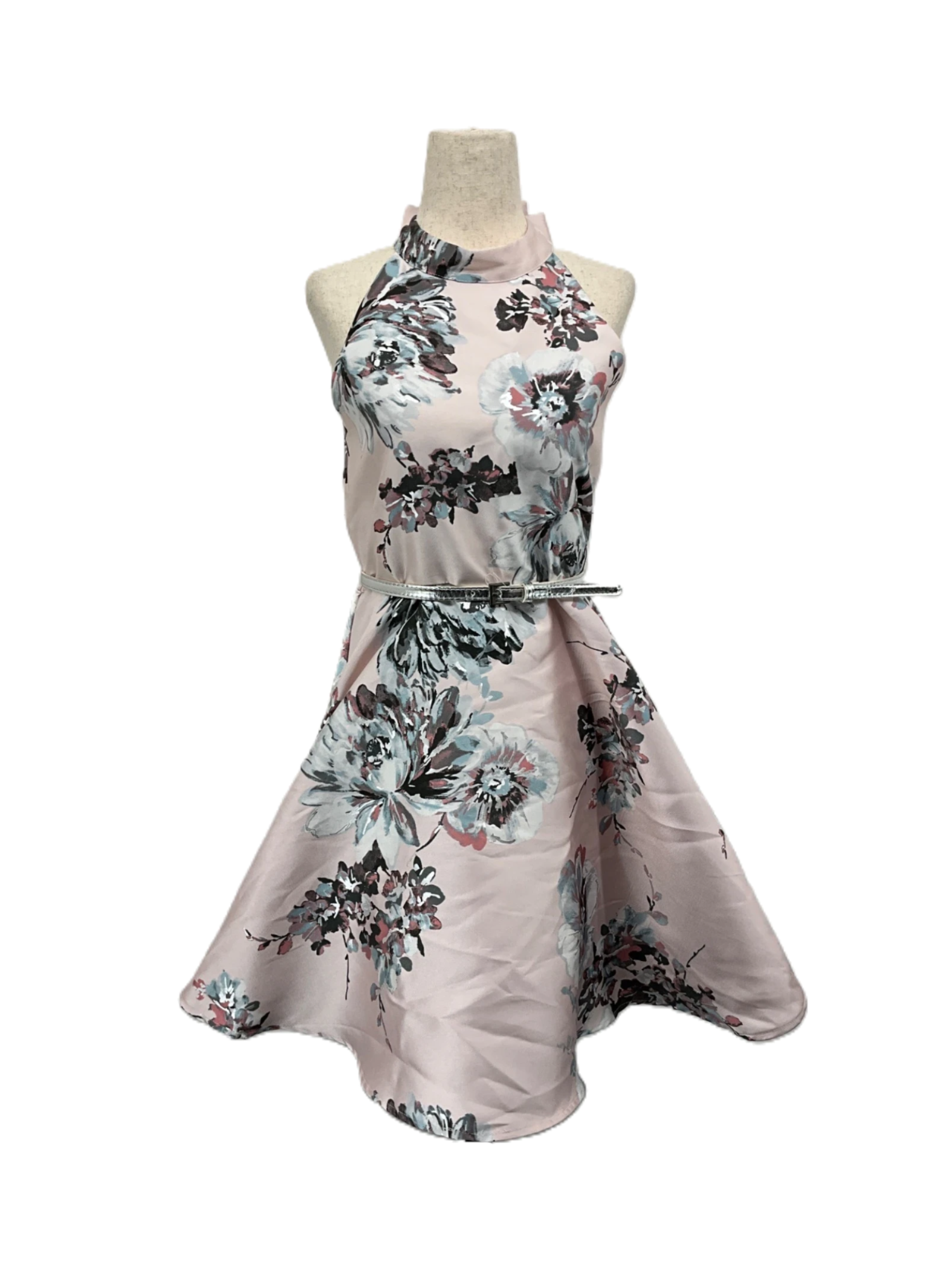 A sleeveless pink floral dress with a belt strap, size 16, suitable for children. and women